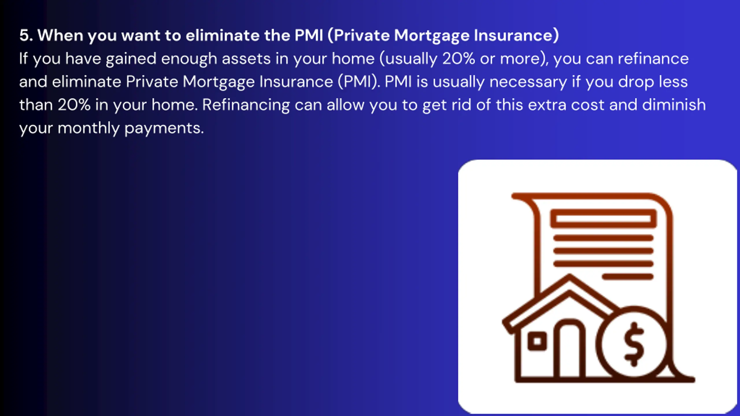 5. When you want to eliminate the PMI (Private Mortgage Insurance) If you have gained enough assets in your home (usually 20% or more), you can refinance and eliminate Private Mortgage Insurance (PMI). PMI is usually necessary if you drop less than 20% in your home. Refinancing can allow you to get rid of this extra cost and diminish your monthly payments.