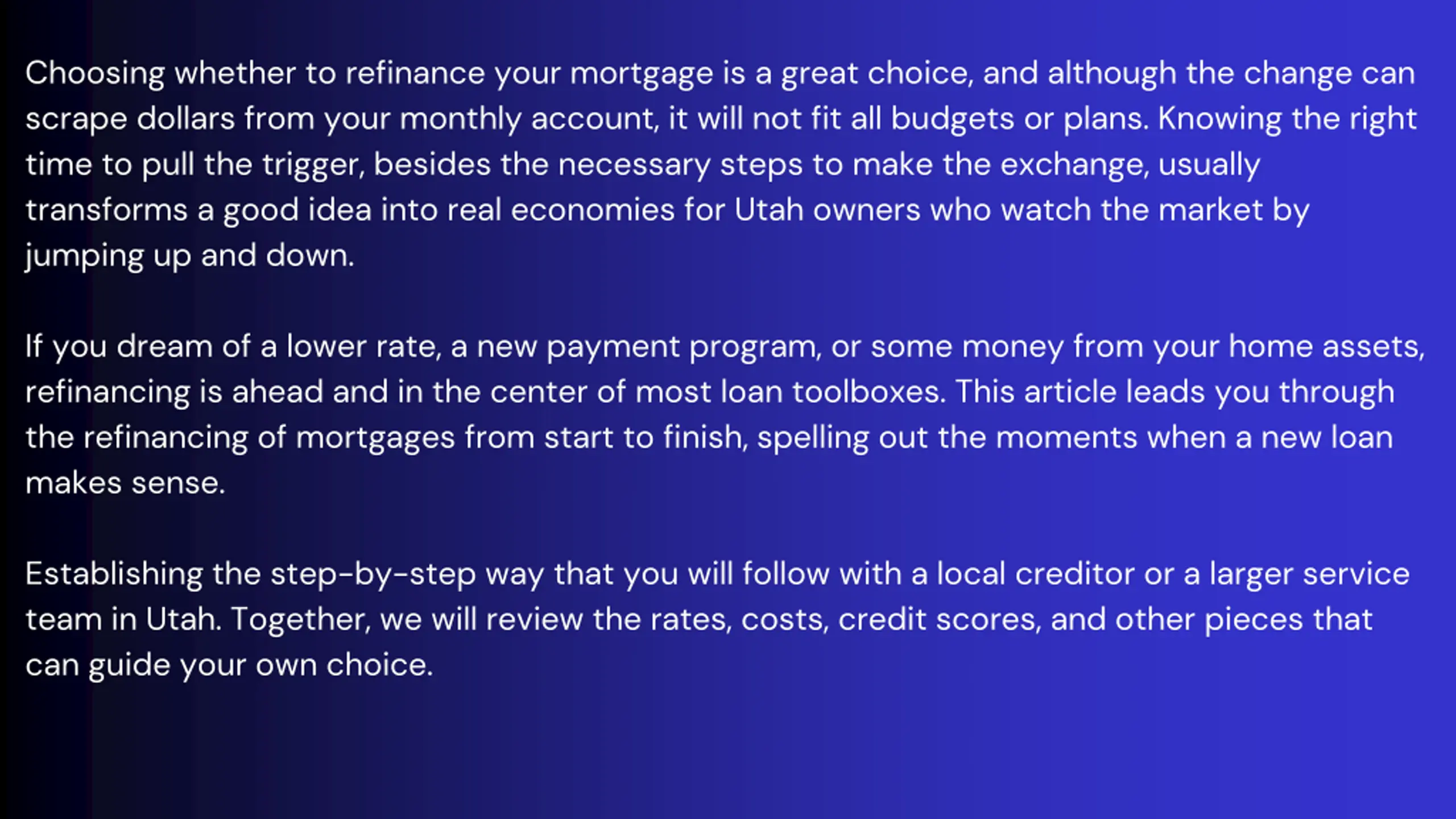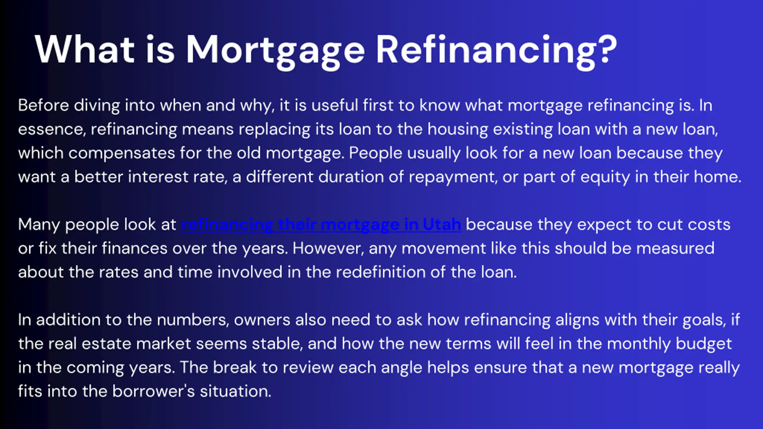 Many people look at refinancing their mortgage in Utah because they expect to cut costs or fix their finances over the years. visit us :- //associatedmtg.com/