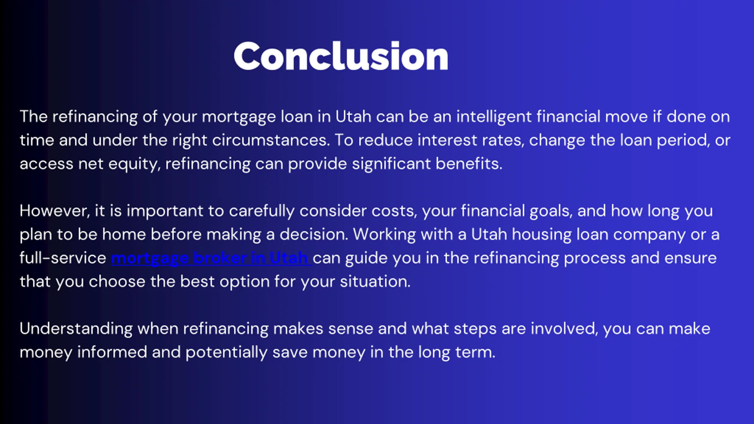 Conclusion The refinancing of your mortgage loan in Utah can be an intelligent financial move if done on time and under the right circumstances. To reduce interest rates, change the loan period, or access net equity, refinancing can provide significant benefits. However, it is important to carefully consider costs, your financial goals, and how long you plan to be home before making a decision. Working with a Utah housing loan company or a full-service mortgage broker in Utah can guide you in the refinancing process and ensure that you choose the best option for your situation. Understanding when refinancing makes sense and what steps are involved, you can make money informed and potentially save money in the long term.