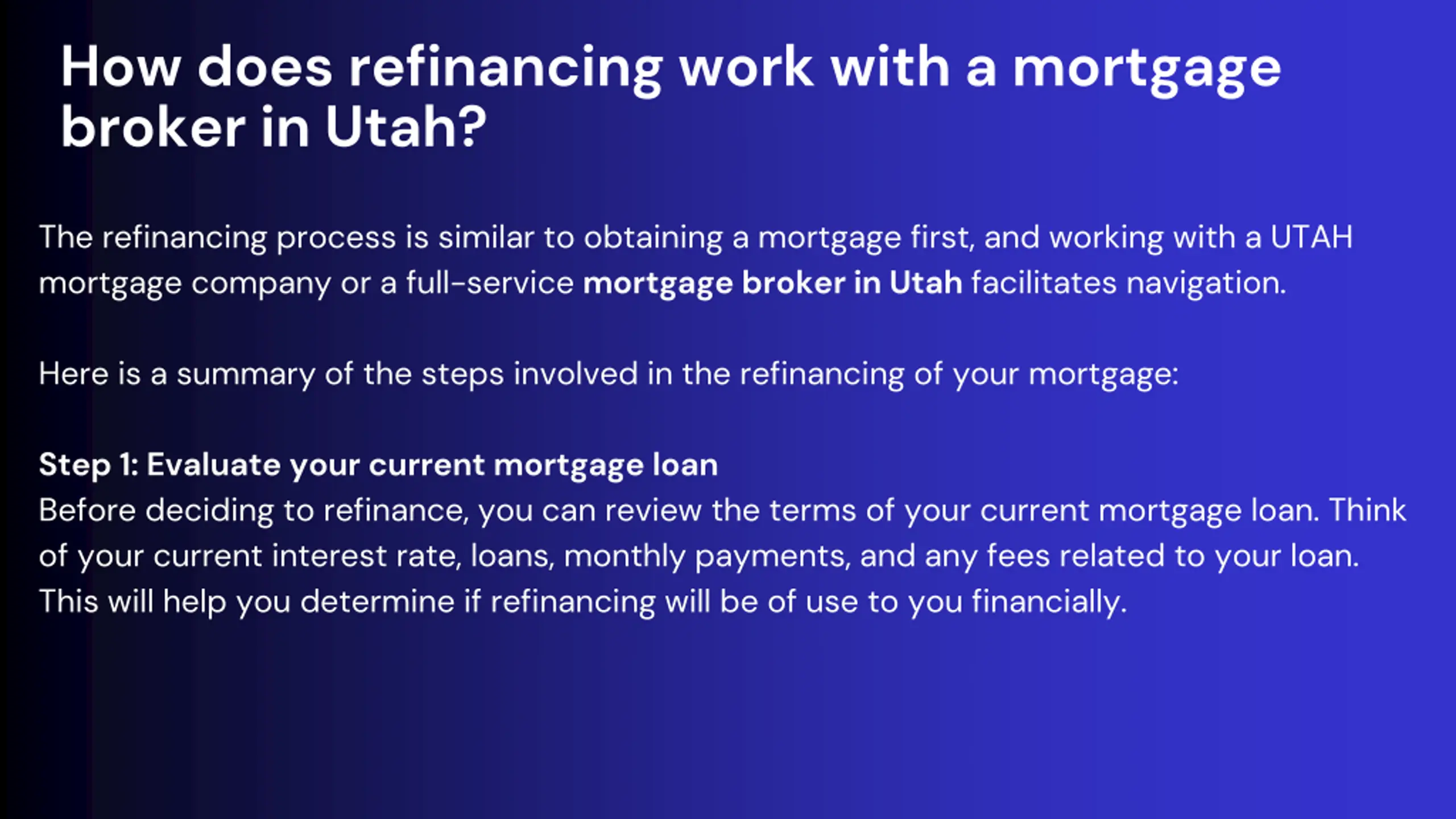 How does refinancing work with a mortgage broker in Utah? The refinancing process is similar to obtaining a mortgage first, and working with a UTAH mortgage company or a full-service mortgage broker in Utah facilitates navigation. Here is a summary of the steps involved in the refinancing of your mortgage: Step 1: Evaluate your current mortgage loan Before deciding to refinance, you can review the terms of your current mortgage loan. Think of your current interest rate, loans, monthly payments, and any fees related to your loan. This will help you determine if refinancing will be of use to you financially.