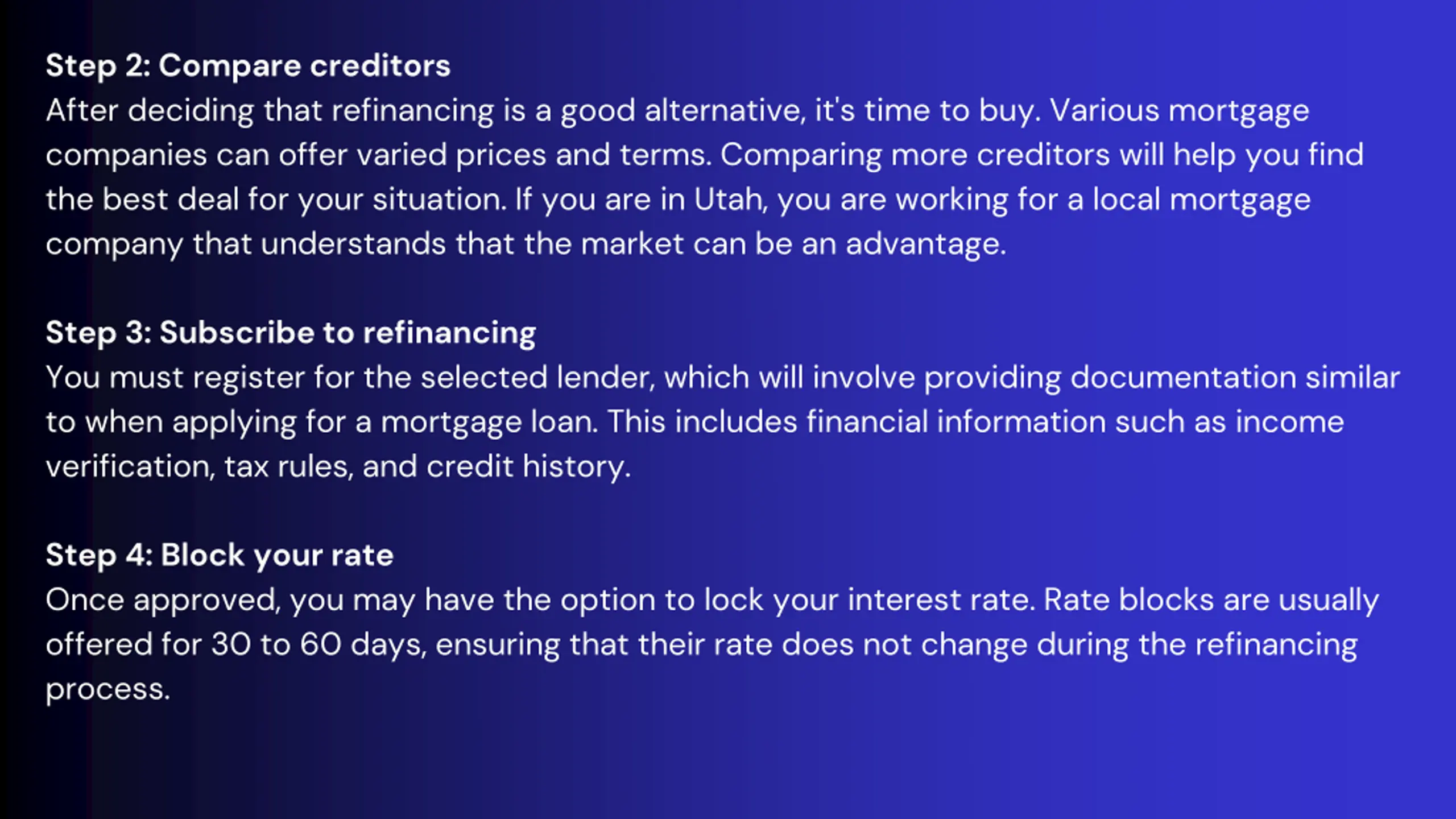 Step 2: Compare creditors After deciding that refinancing is a good alternative, it's time to buy. Various mortgage companies can offer varied prices and terms. Comparing more creditors will help you find the best deal for your situation. If you are in Utah, you are working for a local mortgage company that understands that the market can be an advantage. Step 3: Subscribe to refinancing You must register for the selected lender, which will involve providing documentation similar to when applying for a mortgage loan. This includes financial information such as income verification, tax rules, and credit history. Step 4: Block your rate Once approved, you may have the option to lock your interest rate. Rate blocks are usually offered for 30 to 60 days, ensuring that their rate does not change during the refinancing process.