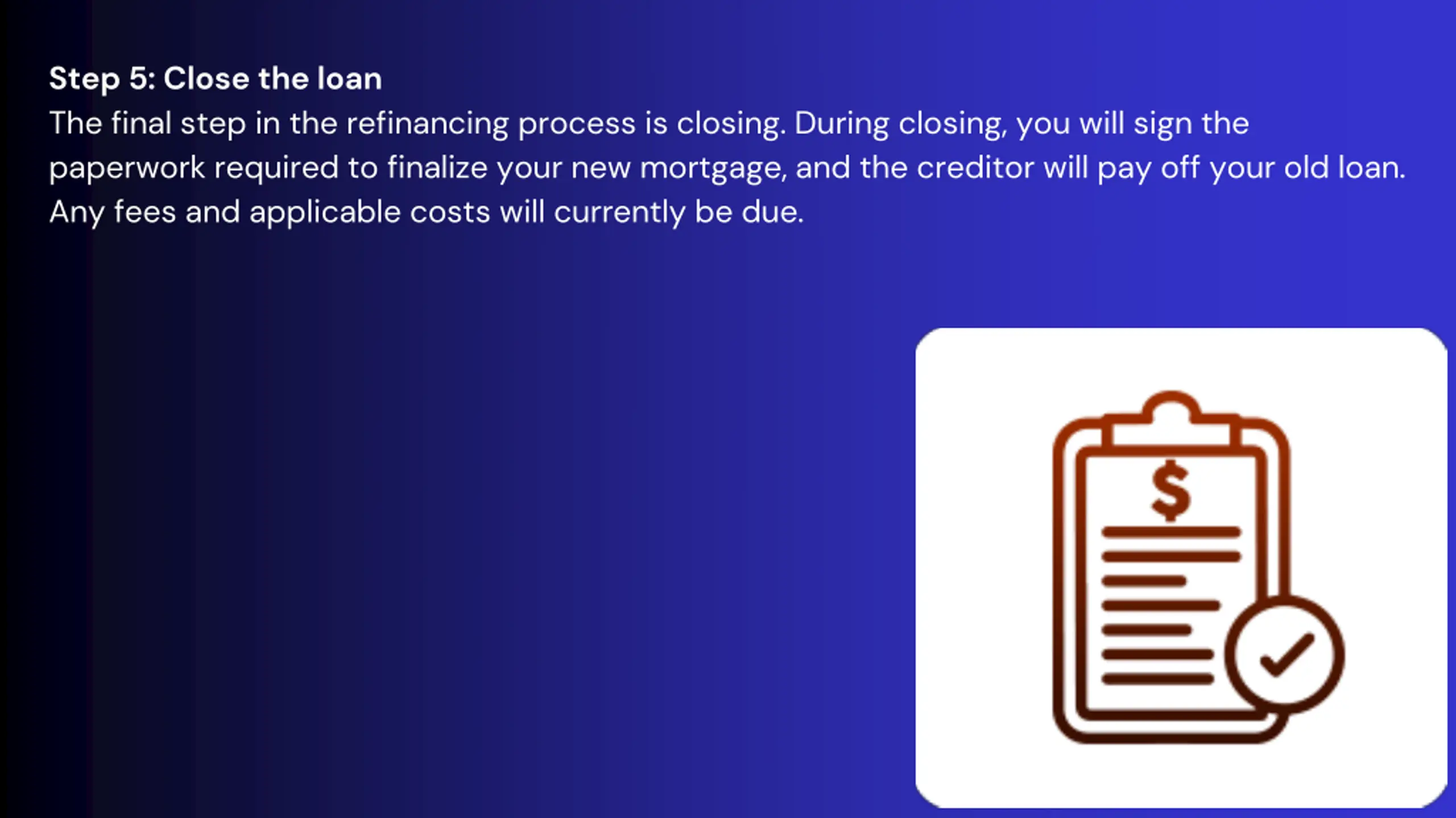 Step 5: Close the loan The final step in the refinancing process is closing. During closing, you will sign the paperwork required to finalize your new mortgage, and the creditor will pay off your old loan. Any fees and applicable costs will currently be due.
