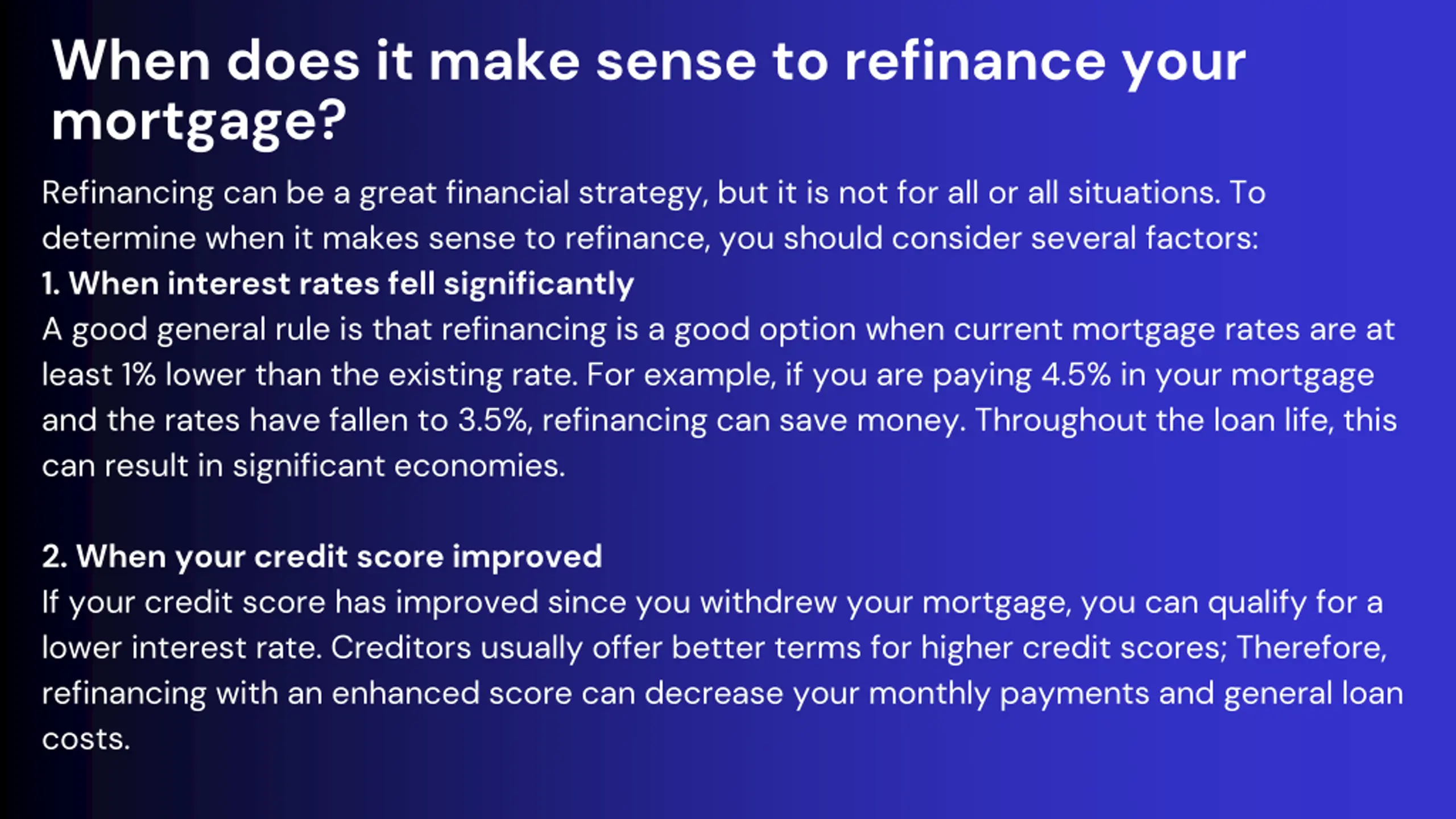 When does it make sense to refinance your mortgage? Refinancing can be a great financial strategy, but it is not for all or all situations. To determine when it makes sense to refinance, you should consider several factors: 1. When interest rates fell significantly A good general rule is that refinancing is a good option when current mortgage rates are at least 1% lower than the existing rate. For example, if you are paying 4.5% in your mortgage and the rates have fallen to 3.5%, refinancing can save money. Throughout the loan life, this can result in significant economies. 2. When your credit score improved If your credit score has improved since you withdrew your mortgage, you can qualify for a lower interest rate. Creditors usually offer better terms for higher credit scores; Therefore, refinancing with an enhanced score can decrease your monthly payments and general loan costs.