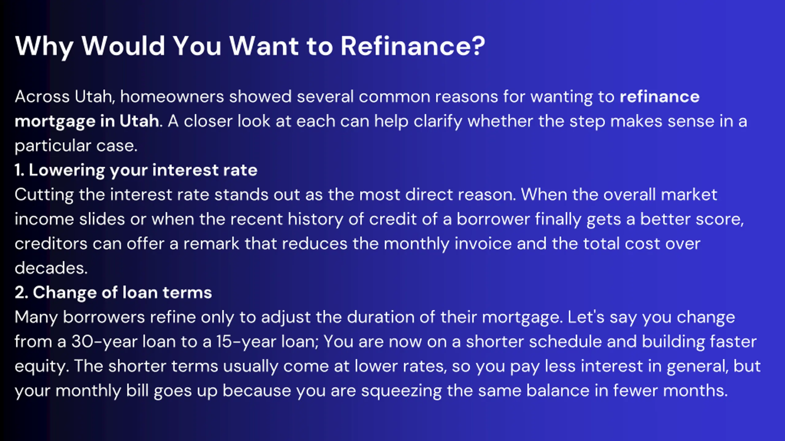 Why Would You Want to Refinance? Across Utah, homeowners showed several common reasons for wanting to refinance mortgage in Utah. A closer look at each can help clarify whether the step makes sense in a particular case. 1. Lowering your interest rate Cutting the interest rate stands out as the most direct reason. When the overall market income slides or when the recent history of credit of a borrower finally gets a better score, creditors can offer a remark that reduces the monthly invoice and the total cost over decades. 2. Change of loan terms Many borrowers refine only to adjust the duration of their mortgage. Let's say you change from a 30-year loan to a 15-year loan; You are now on a shorter schedule and building faster equity. The shorter terms usually come at lower rates, so you pay less interest in general, but your monthly bill goes up because you are squeezing the same balance in fewer months.