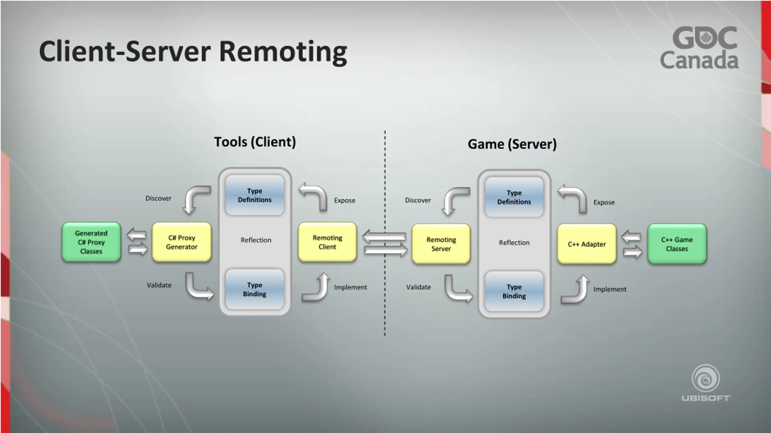 Client-Server Remoting Tools (Client) Game (Server) Type Type Discover Definitions Discover Expose Definitions Expose Generated C# Proxy Classes C# Proxy Generator Remoting Client Remoting Server C++ Game Classes Reflection Reflection C++ Adapter Type Binding Validate Type Binding Validate Implement Implement