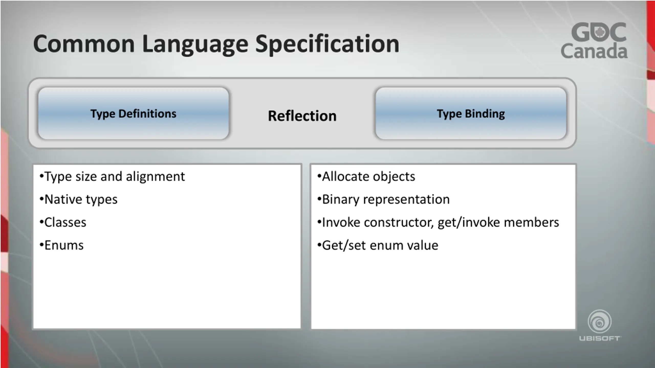 Common Language Specification Type Definitions Type Binding Reflection Type size and alignment Native types Classes Enums Allocate objects Binary representation Invoke constructor, get/invoke members Get/set enum value