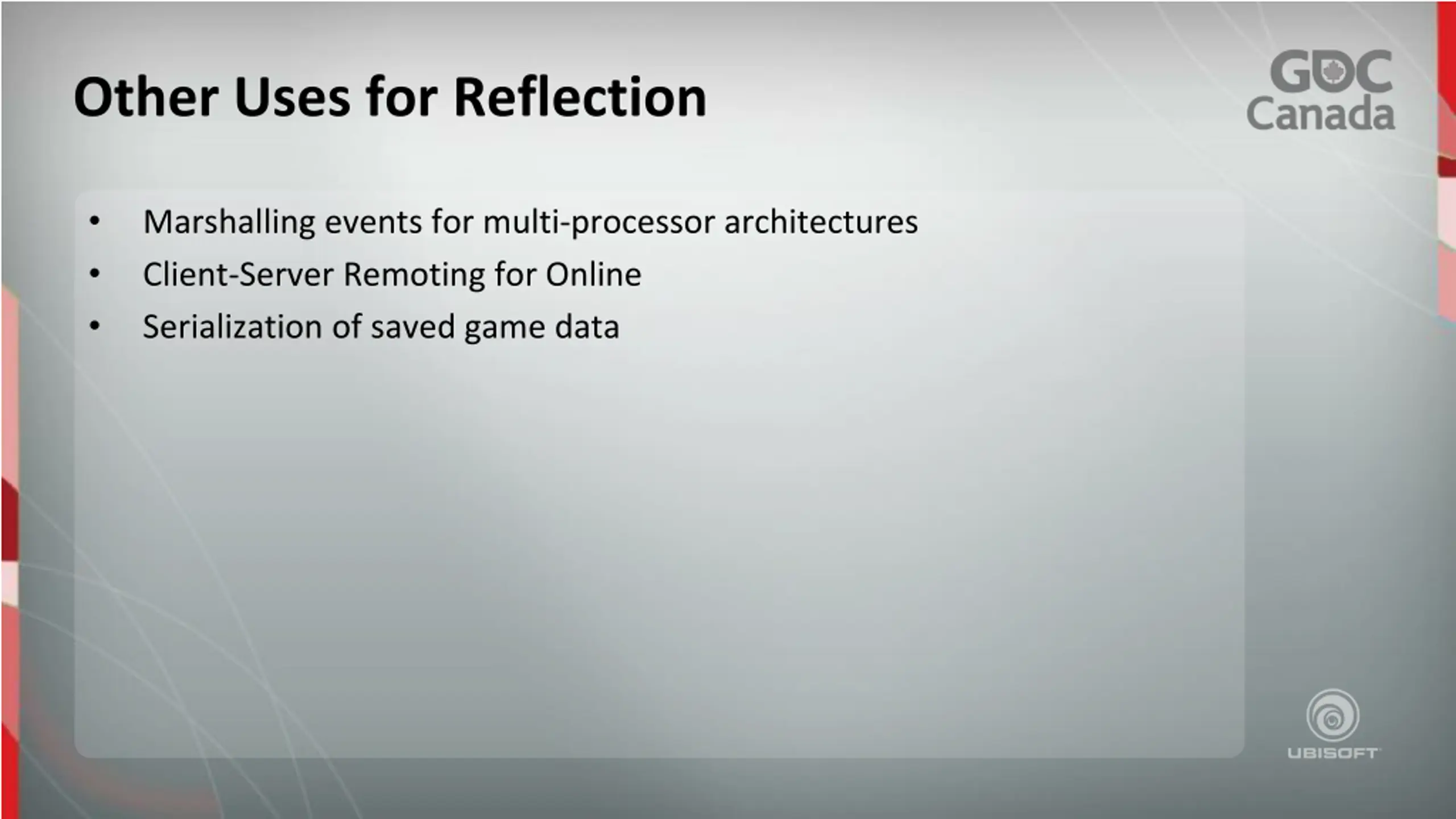 Other Uses for Reflection Marshalling events for multi-processor architectures Client-Server Remoting for Online Serialization of saved game data