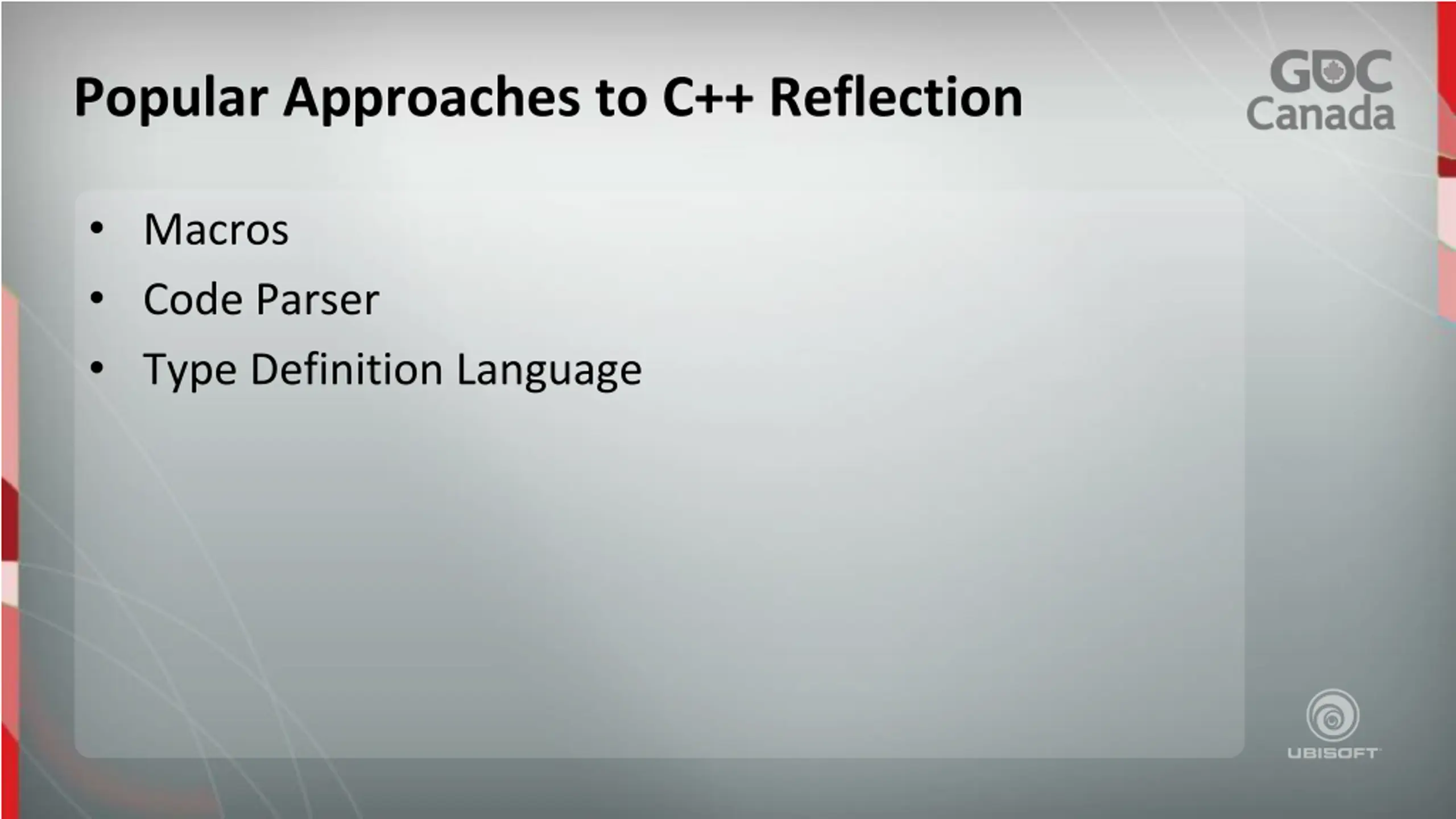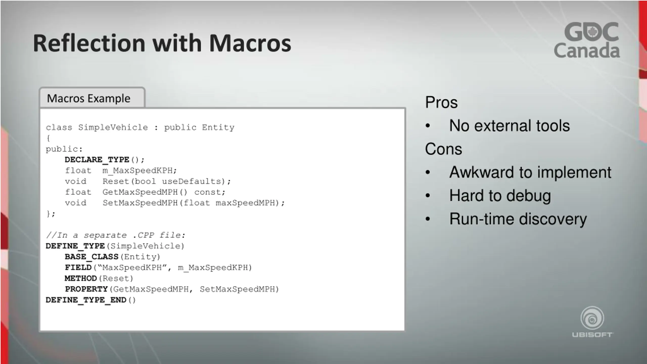 Reflection with Macros Pros Cons Macros Example No external tools class SimpleVehicle : public Entity { public: DECLARE_TYPE(); float m_MaxSpeedKPH; void Reset(bool useDefaults); float GetMaxSpeedMPH() const; void SetMaxSpeedMPH(float maxSpeedMPH); }; Awkward to implement Hard to debug Run-time discovery //In a separate .CPP file: DEFINE_TYPE(SimpleVehicle) BASE_CLASS(Entity) FIELD( MaxSpeedKPH , m_MaxSpeedKPH) METHOD(Reset) PROPERTY(GetMaxSpeedMPH, SetMaxSpeedMPH) DEFINE_TYPE_END()