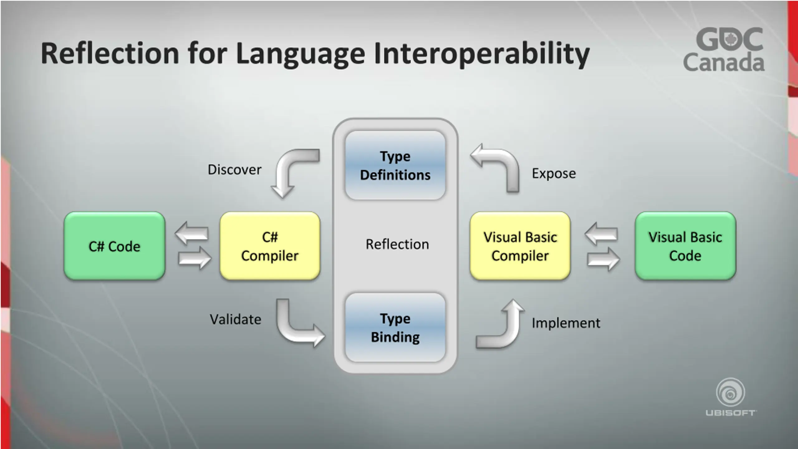 Reflection for Language Interoperability Type Discover Expose Definitions C# Visual Basic Compiler Visual Basic Code Reflection C# Code Compiler Type Binding Validate Implement