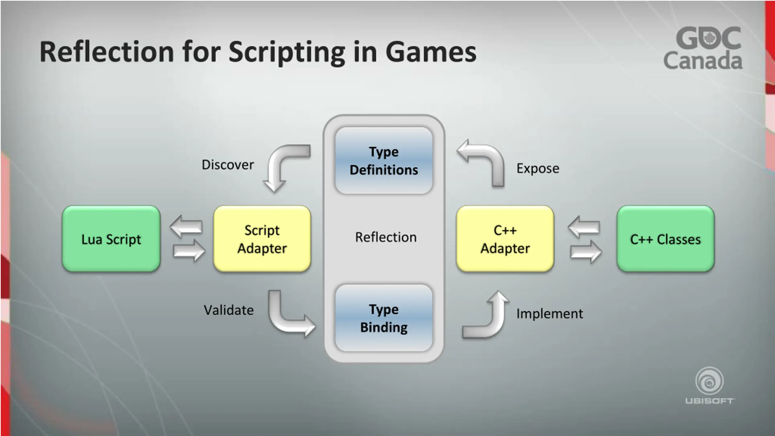Reflection for Scripting in Games Type Discover Expose Definitions Script Adapter C++ Adapter Reflection Lua Script C++ Classes Type Binding Validate Implement