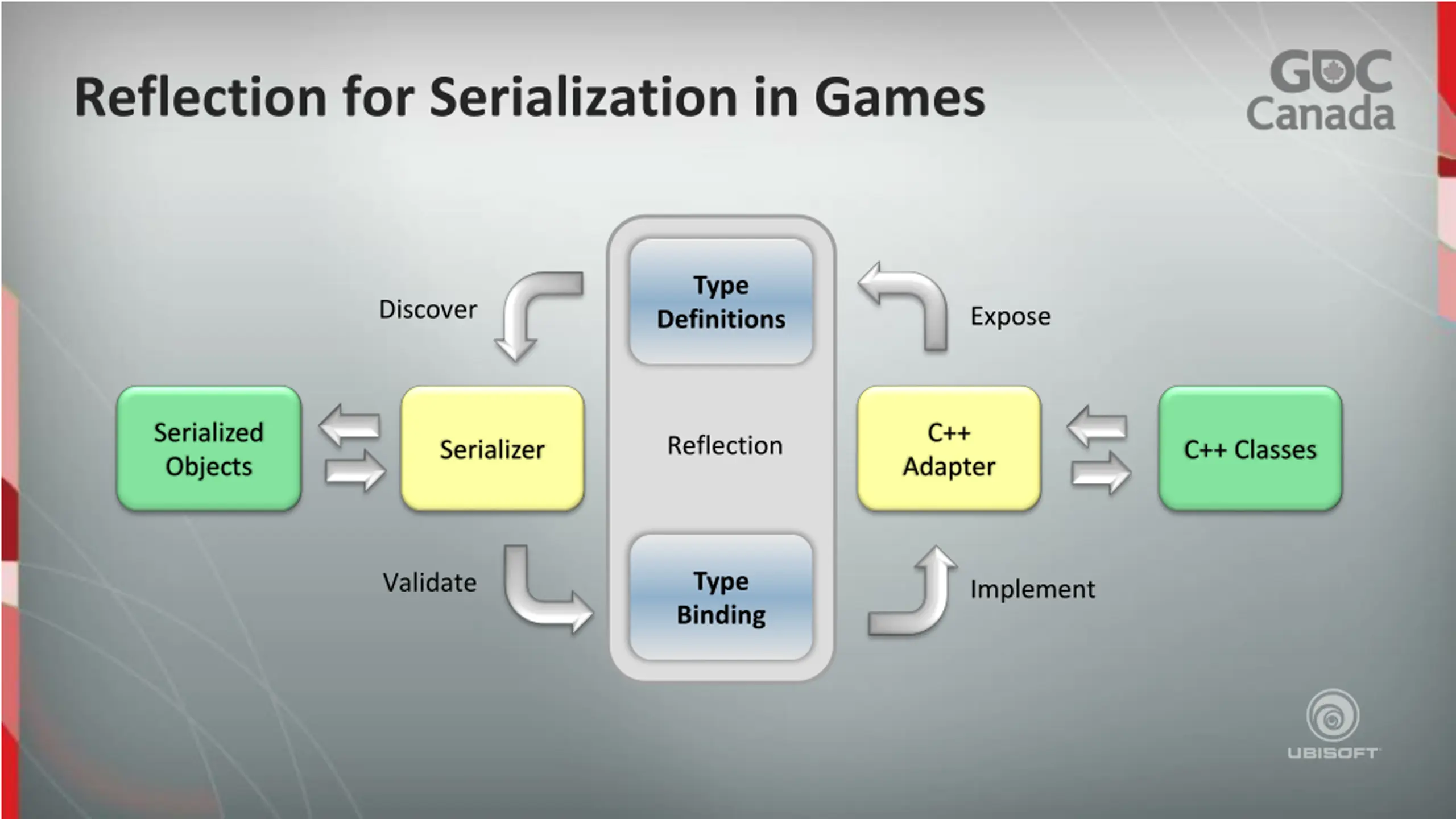 Reflection for Serialization in Games Type Discover Expose Definitions Serialized Objects C++ Adapter Reflection Serializer C++ Classes Type Binding Validate Implement