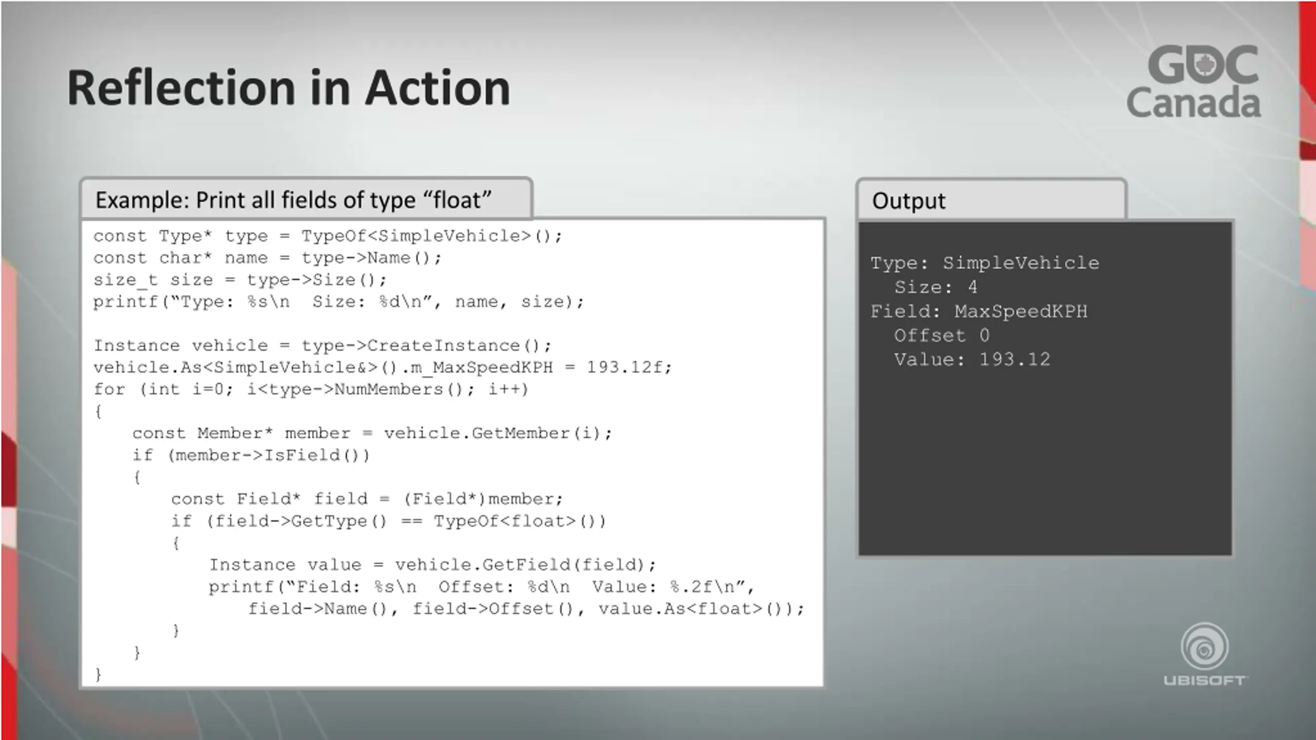 Reflection in Action Example: Print all fields of type float Output const Type* type = TypeOf<SimpleVehicle>(); const char* name = type->Name(); size_t size = type->Size(); printf( Type: %s\n Size: %d\n , name, size); Type: SimpleVehicle Size: 4 Field: MaxSpeedKPH Offset 0 Value: 193.12 Instance vehicle = type->CreateInstance(); vehicle.As<SimpleVehicle&>().m_MaxSpeedKPH = 193.12f; for (int i=0; i<type->NumMembers(); i++) { const Member* member = vehicle.GetMember(i); if (member->IsField()) { const Field* field = (Field*)member; if (field->GetType() == TypeOf<float>()) { Instance value = vehicle.GetField(field); printf( Field: %s\n Offset: %d\n Value: %.2f\n , field->Name(), field->Offset(), value.As<float>()); } } }