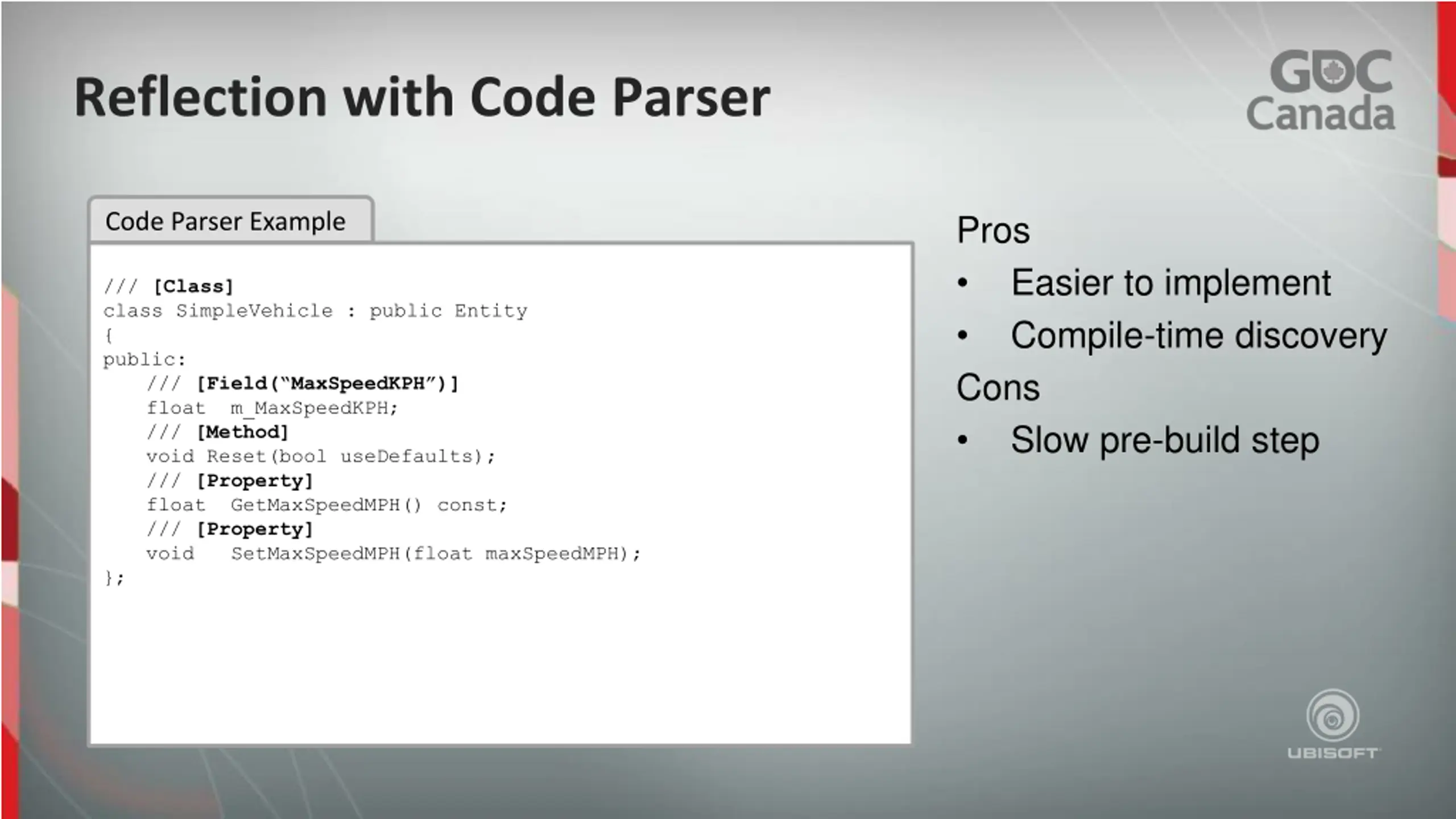 Reflection with Code Parser Pros Cons Code Parser Example Easier to implement Compile-time discovery /// [Class] class SimpleVehicle : public Entity { public: /// [Field( MaxSpeedKPH )] float m_MaxSpeedKPH; /// [Method] void Reset(bool useDefaults); /// [Property] float GetMaxSpeedMPH() const; /// [Property] void SetMaxSpeedMPH(float maxSpeedMPH); }; Slow pre-build step