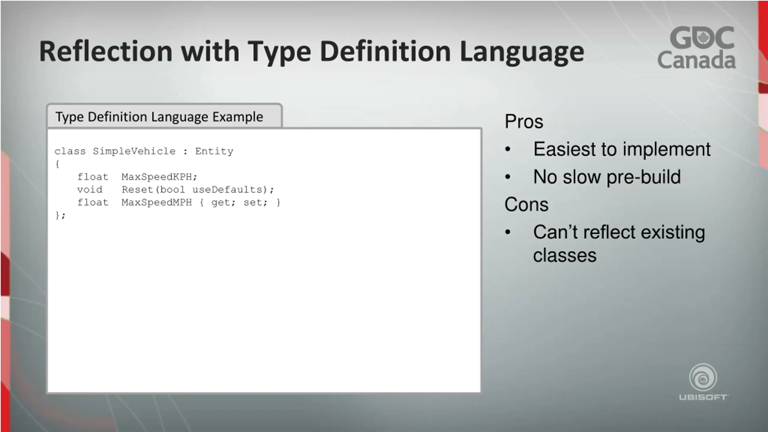 Reflection with Type Definition Language Pros Cons Type Definition Language Example Easiest to implement No slow pre-build class SimpleVehicle : Entity { float MaxSpeedKPH; void Reset(bool useDefaults); float MaxSpeedMPH { get; set; } }; Can t reflect existing classes