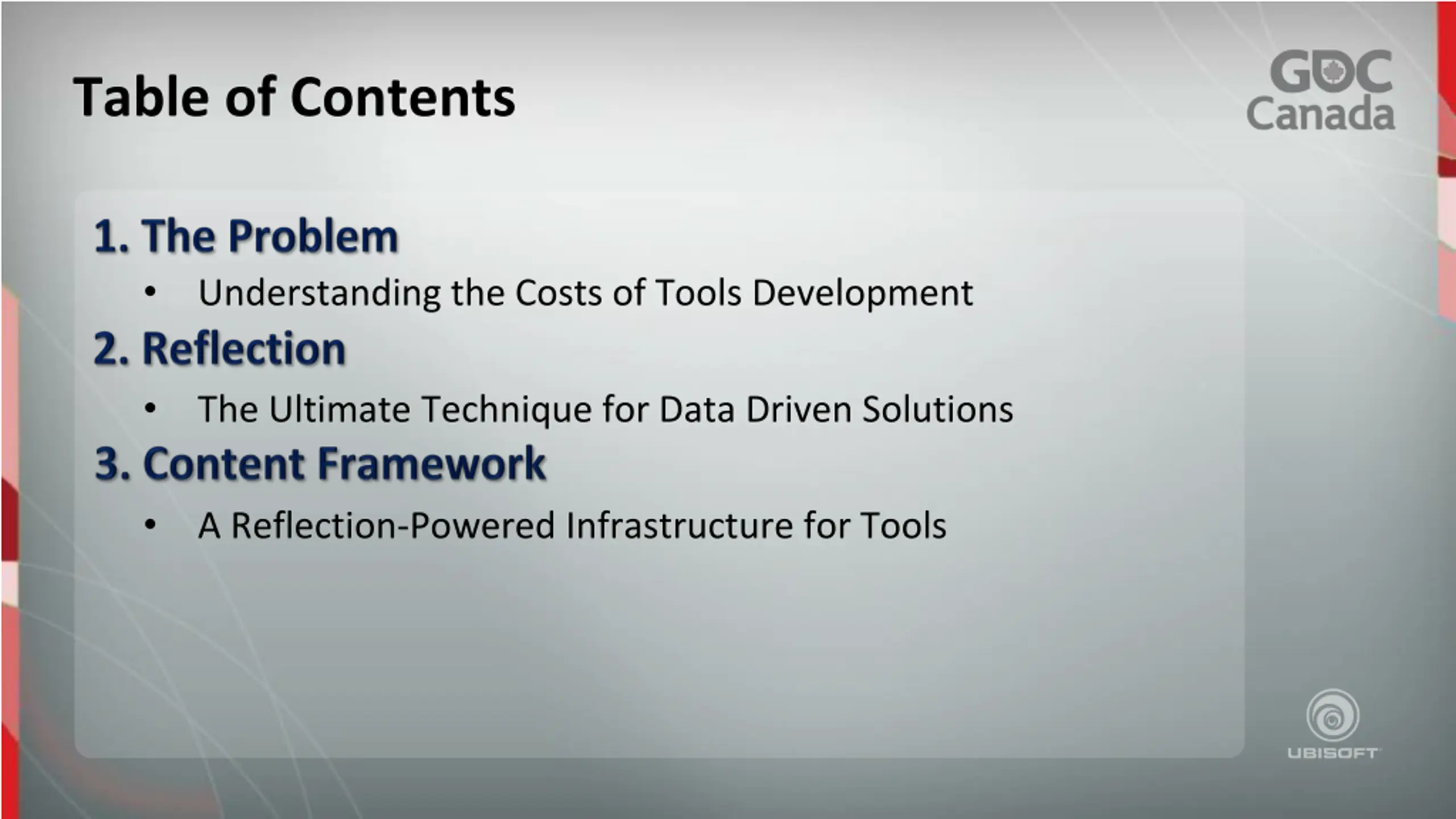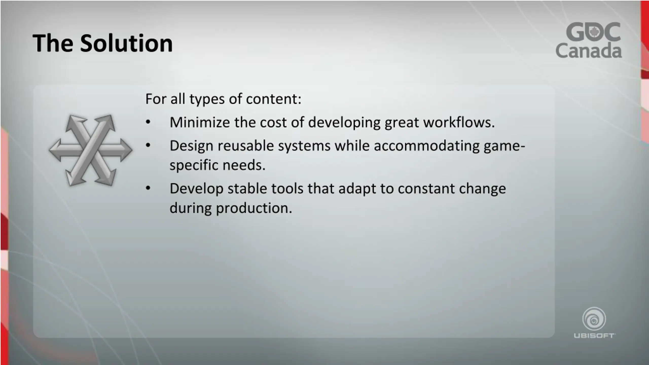 The Solution For all types of content: Minimize the cost of developing great workflows. Design reusable systems while accommodating game- specific needs. Develop stable tools that adapt to constant change during production.