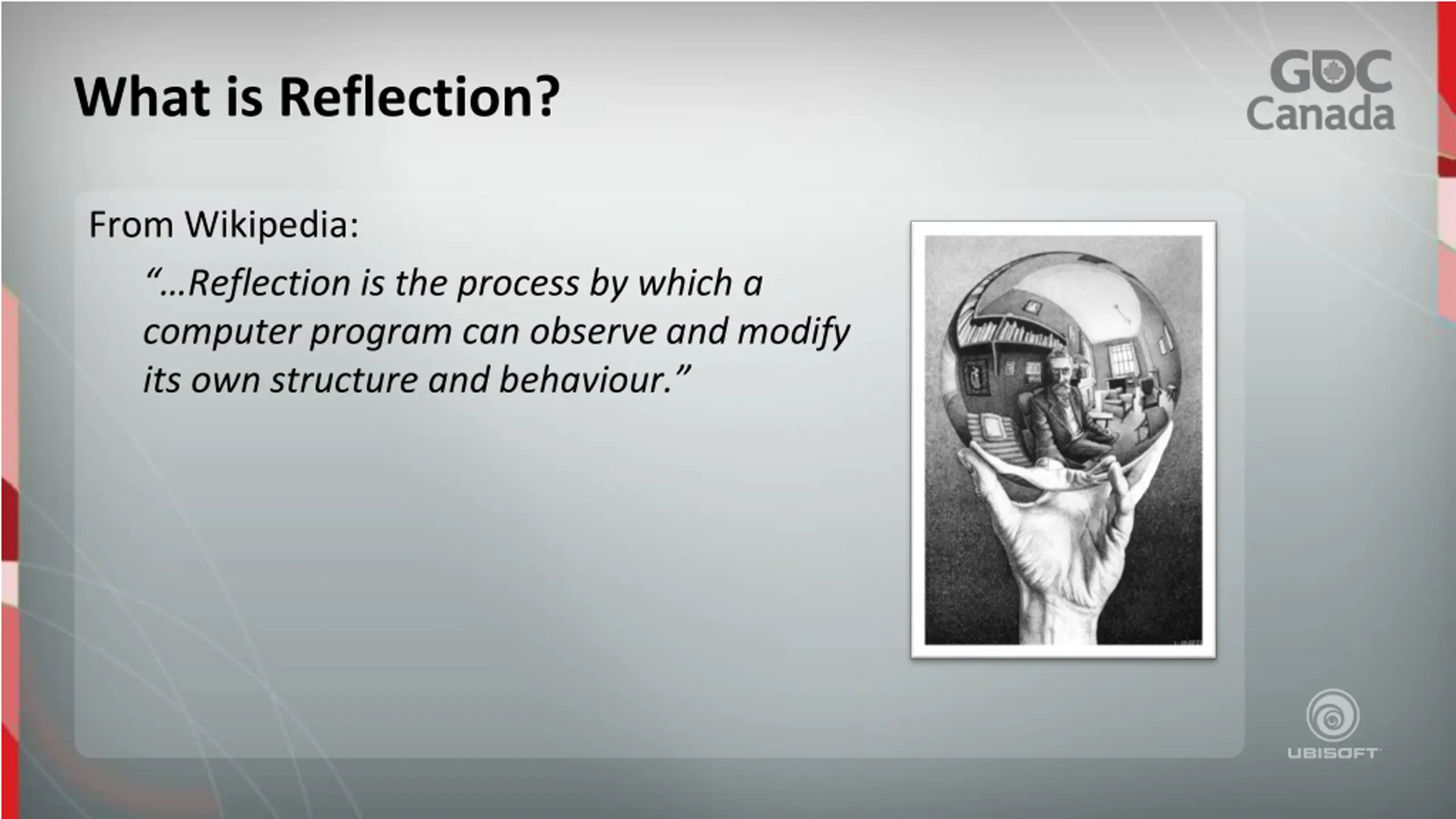 What is Reflection? From Wikipedia: Reflection is the process by which a computer program can observe and modify its own structure and behaviour.