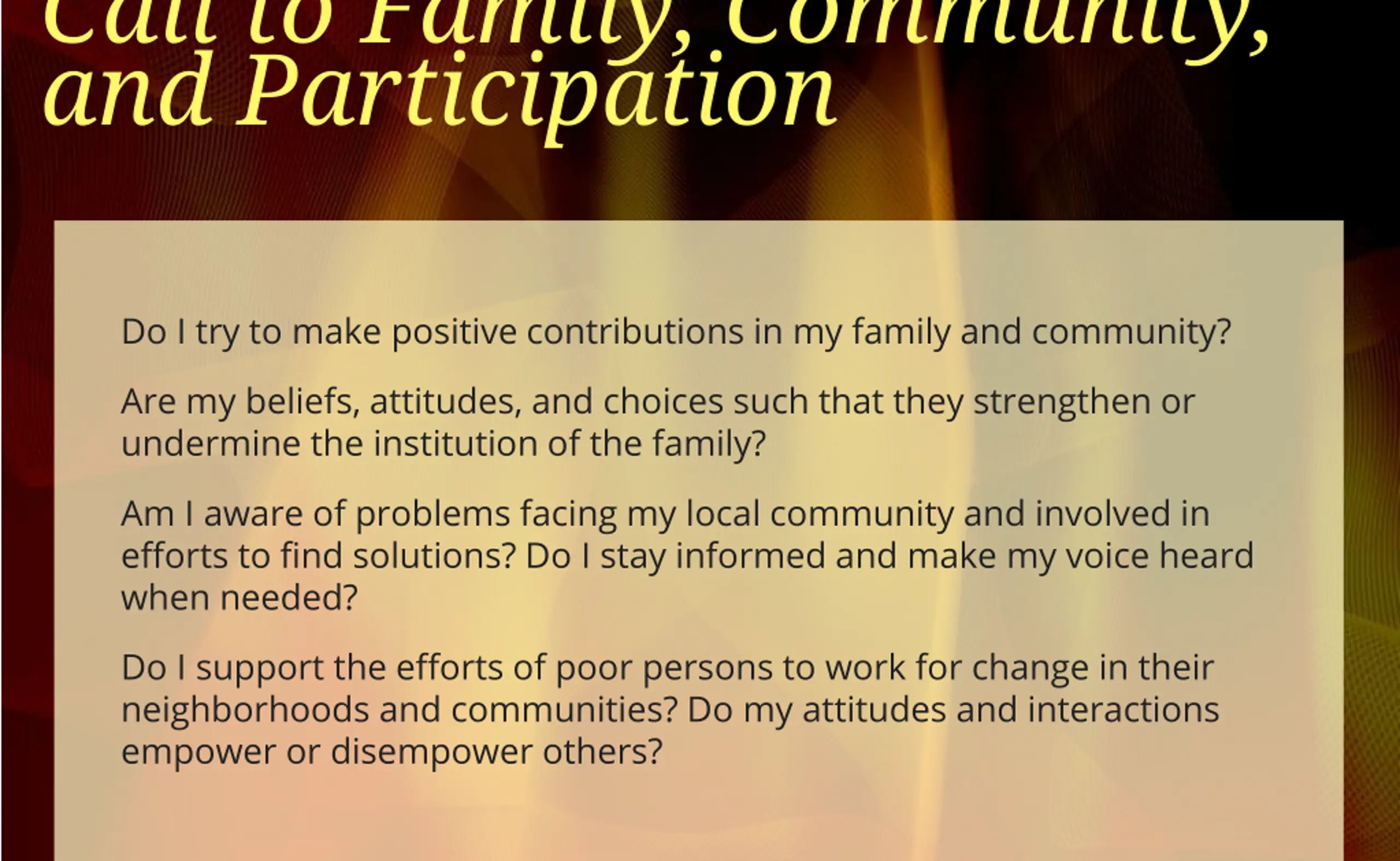 Call to Family, Community, and Participation Do I try to make positive contributions in my family and community? Are my beliefs, attitudes, and choices such that they strengthen or undermine the institution of the family? Am I aware of problems facing my local community and involved in efforts to find solutions? Do I stay informed and make my voice heard when needed? Do I support the efforts of poor persons to work for change in their neighborhoods and communities? Do my attitudes and interactions empower or disempower others?