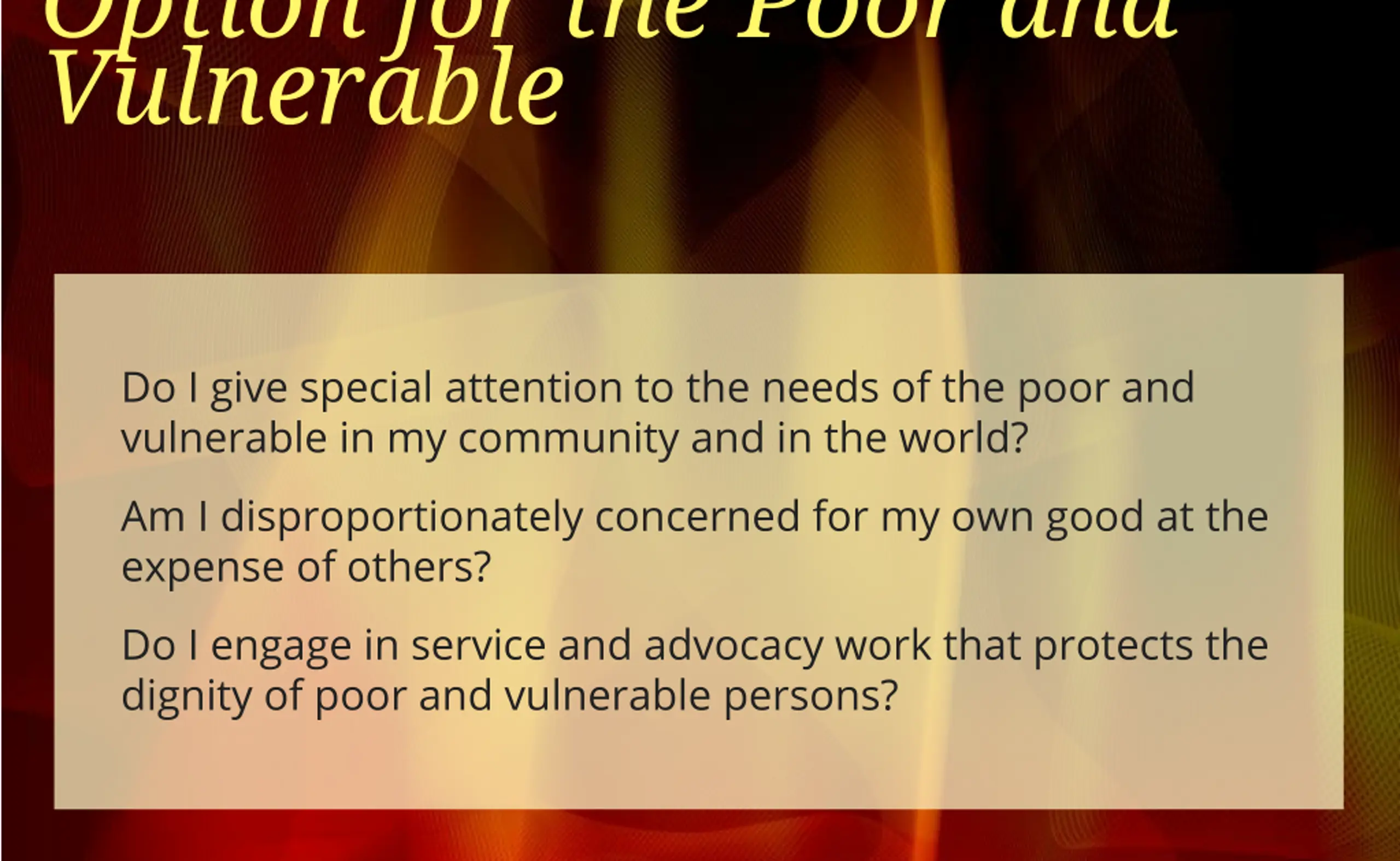 Option for the Poor and Vulnerable Do I give special attention to the needs of the poor and vulnerable in my community and in the world? Am I disproportionately concerned for my own good at the expense of others? Do I engage in service and advocacy work that protects the dignity of poor and vulnerable persons?