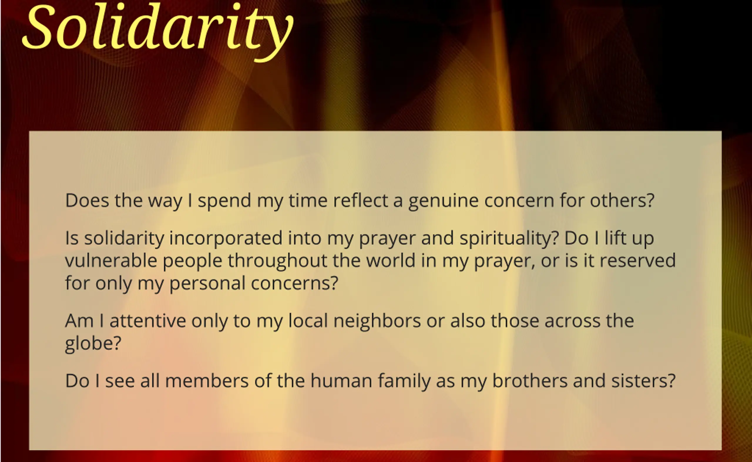 Solidarity Does the way I spend my time reflect a genuine concern for others? Is solidarity incorporated into my prayer and spirituality? Do I lift up vulnerable people throughout the world in my prayer, or is it reserved for only my personal concerns? Am I attentive only to my local neighbors or also those across the globe? Do I see all members of the human family as my brothers and sisters?