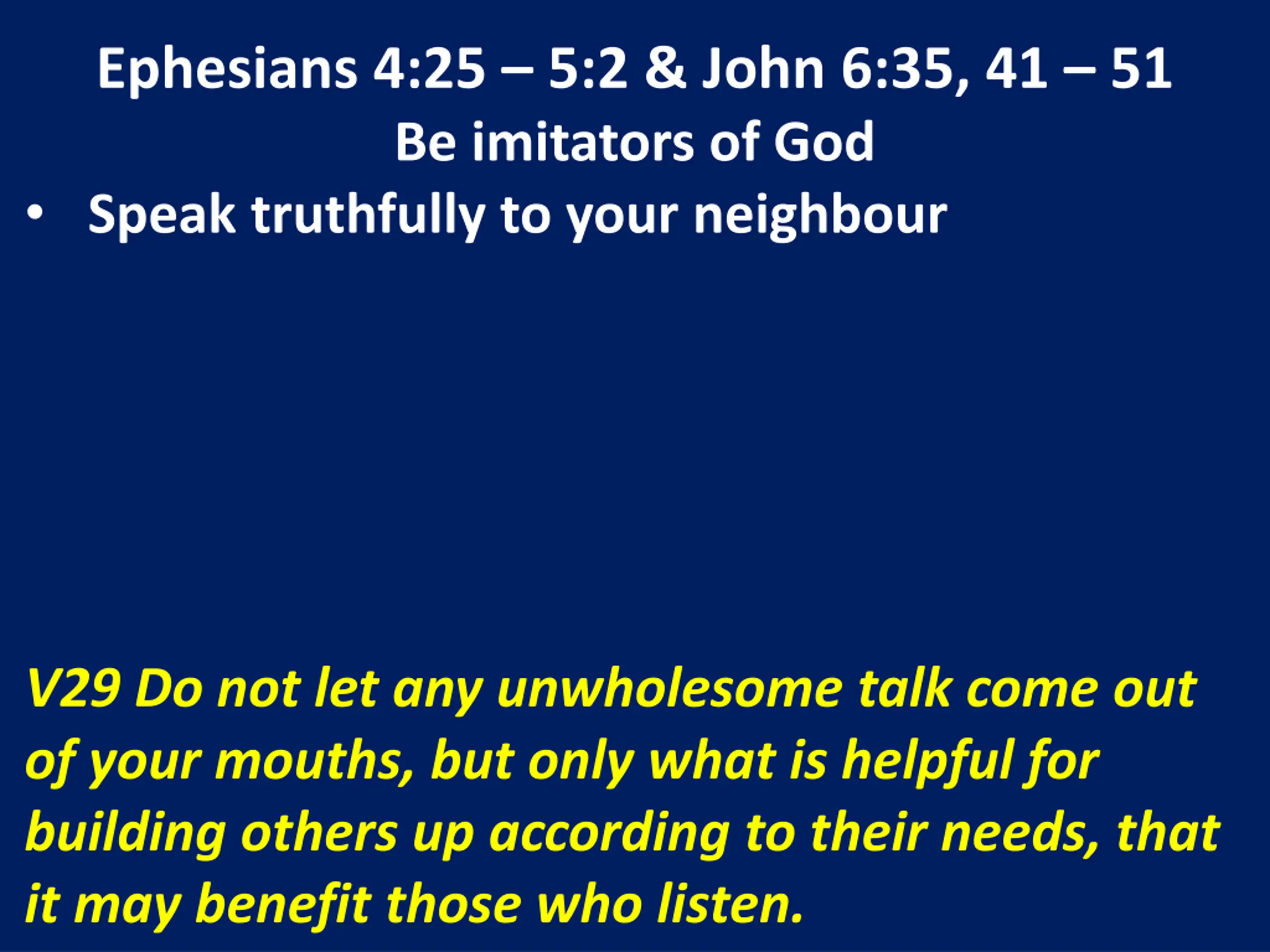 Ephesians 4:25 5:2 & John 6:35, 41 51 Be imitators of God Speak truthfully to your neighbour V29 Do not let any unwholesome talk come out of your mouths, but only what is helpful for building others up according to their needs, that it may benefit those who listen.