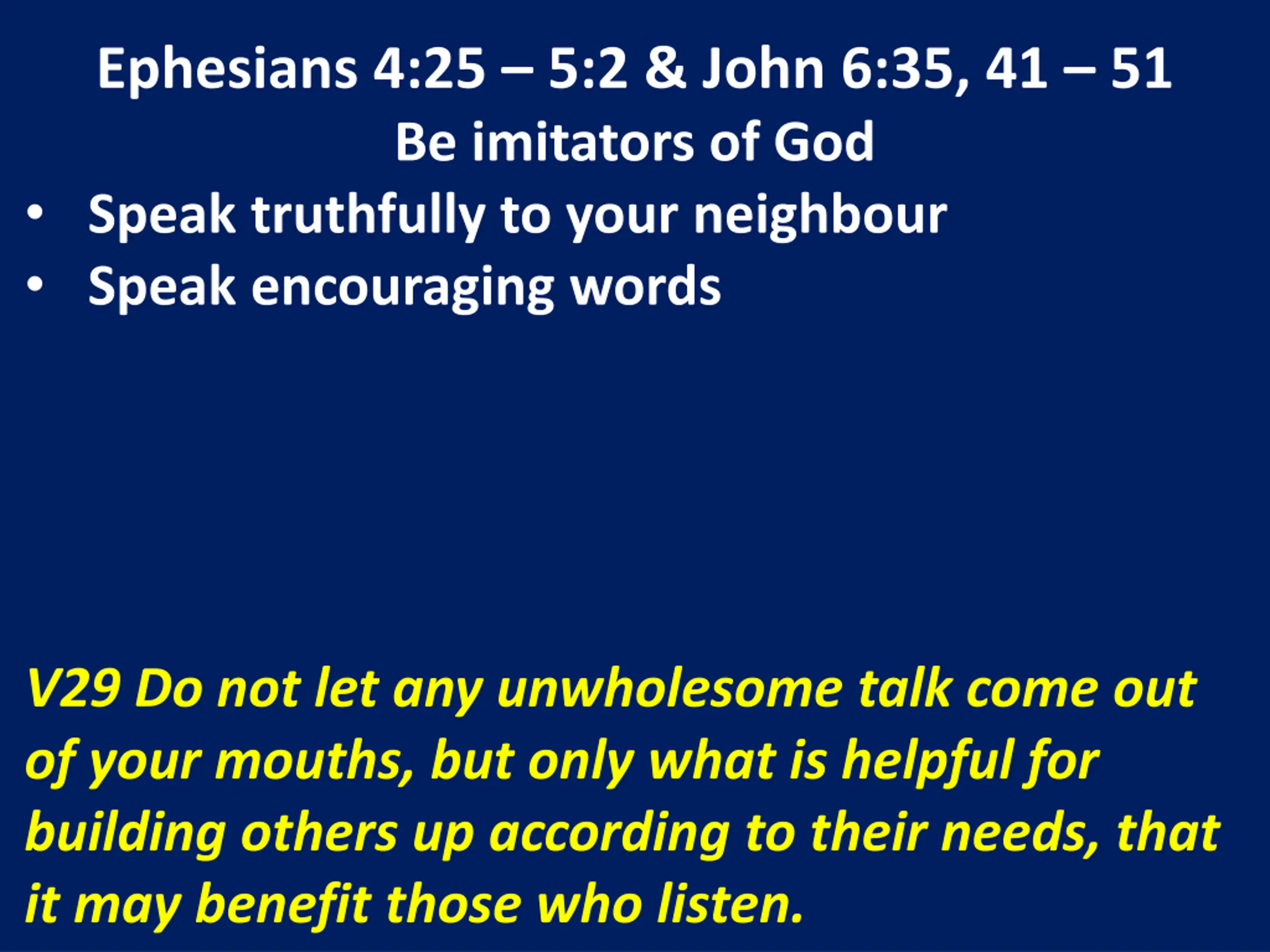 Ephesians 4:25 5:2 & John 6:35, 41 51 Be imitators of God Speak truthfully to your neighbour Speak encouraging words V29 Do not let any unwholesome talk come out of your mouths, but only what is helpful for building others up according to their needs, that it may benefit those who listen.