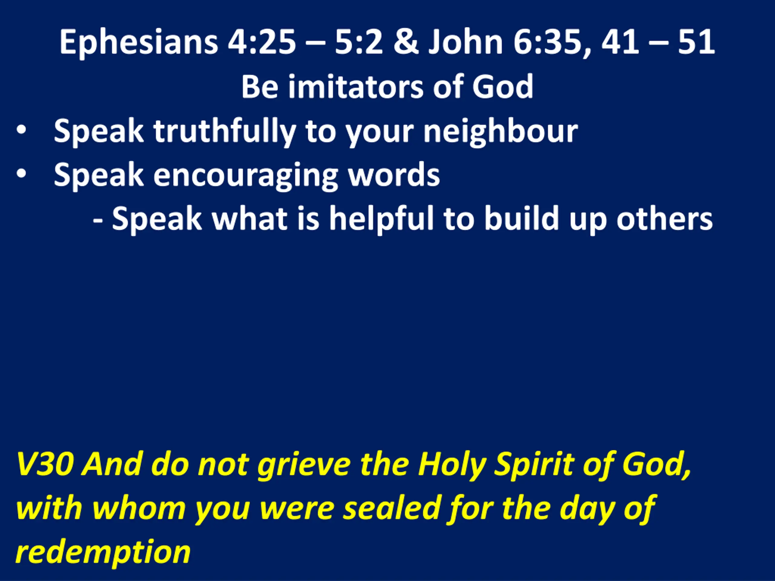 Ephesians 4:25 5:2 & John 6:35, 41 51 Be imitators of God Speak truthfully to your neighbour Speak encouraging words - Speak what is helpful to build up others V30 And do not grieve the Holy Spirit of God, with whom you were sealed for the day of redemption