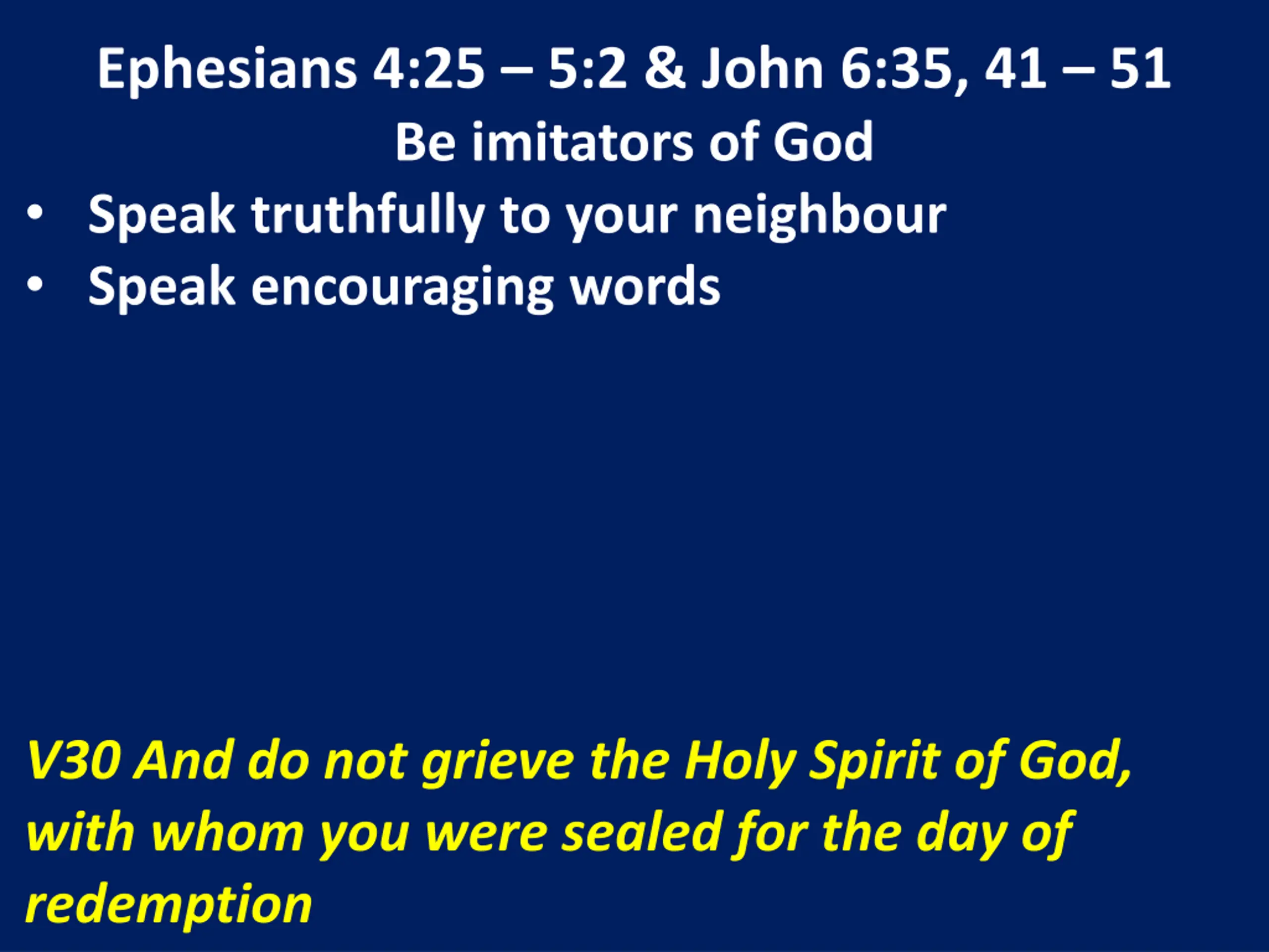 Ephesians 4:25 5:2 & John 6:35, 41 51 Be imitators of God Speak truthfully to your neighbour Speak encouraging words V30 And do not grieve the Holy Spirit of God, with whom you were sealed for the day of redemption