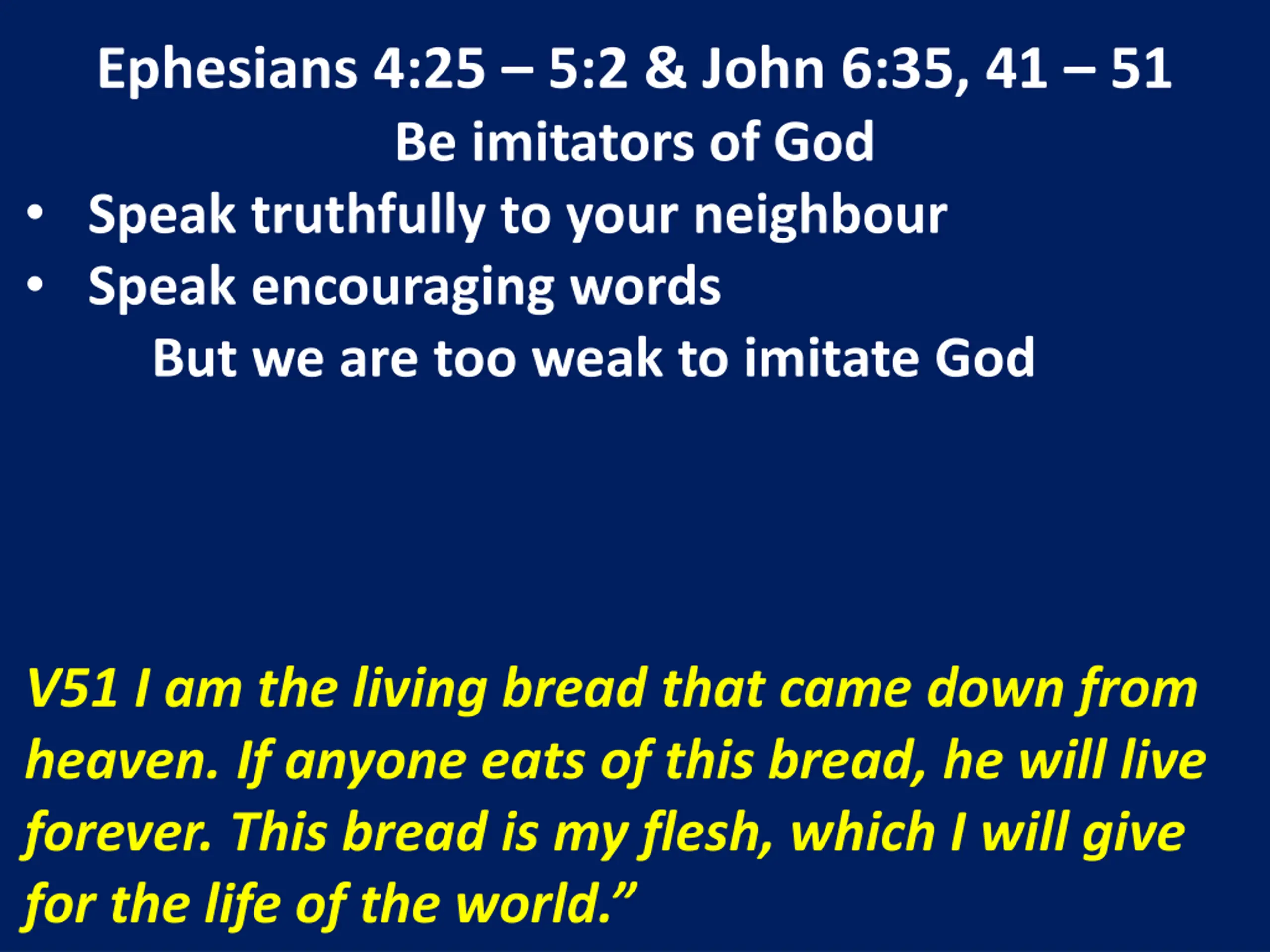 Ephesians 4:25 5:2 & John 6:35, 41 51 Be imitators of God Speak truthfully to your neighbour Speak encouraging words But we are too weak to imitate God V51 I am the living bread that came down from heaven. If anyone eats of this bread, he will live forever. This bread is my flesh, which I will give for the life of the world.