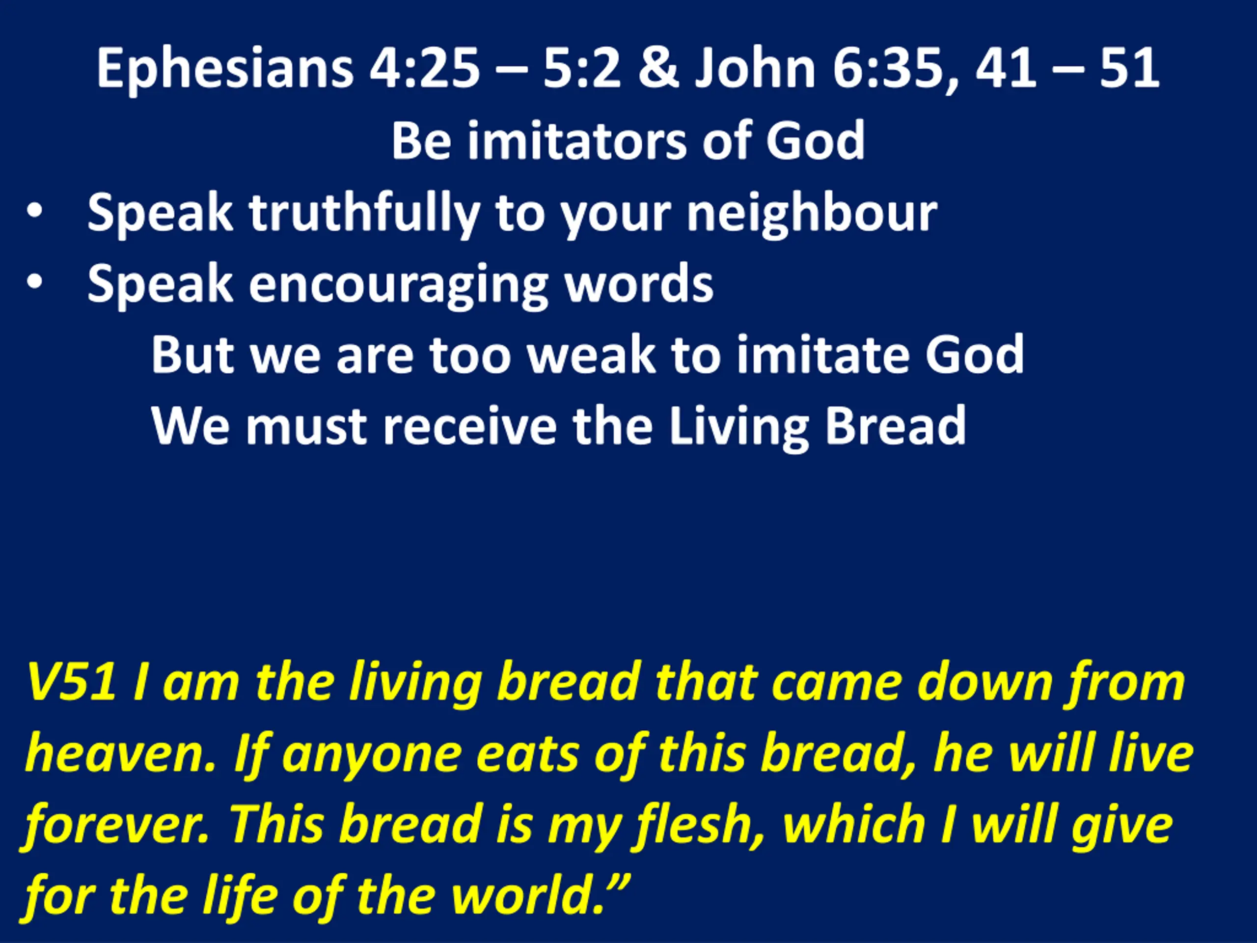 Ephesians 4:25 5:2 & John 6:35, 41 51 Be imitators of God Speak truthfully to your neighbour Speak encouraging words But we are too weak to imitate God We must receive the Living Bread V51 I am the living bread that came down from heaven. If anyone eats of this bread, he will live forever. This bread is my flesh, which I will give for the life of the world.