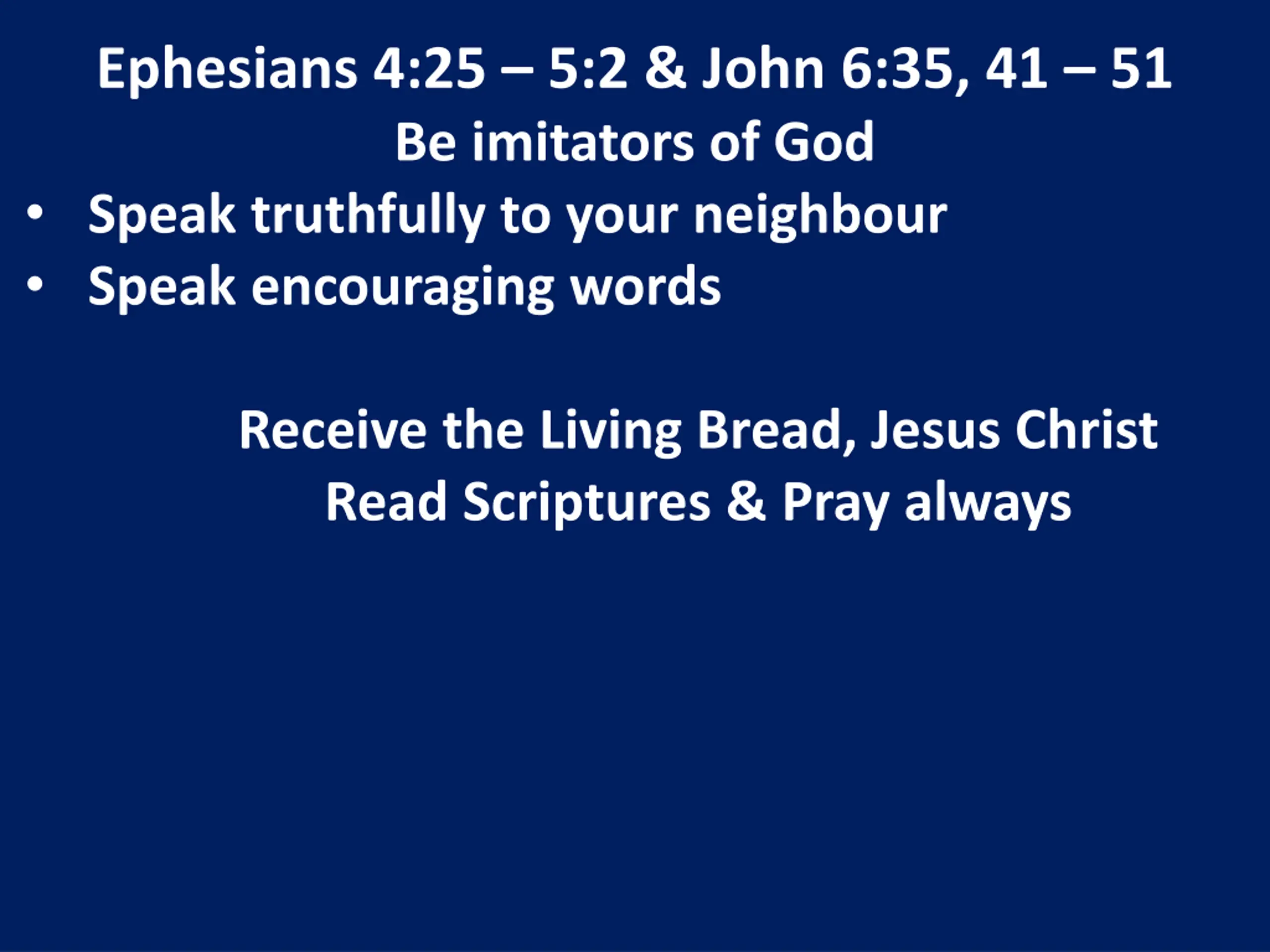 Ephesians 4:25 5:2 & John 6:35, 41 51 Be imitators of God Speak truthfully to your neighbour Speak encouraging words Receive the Living Bread, Jesus Christ Read Scriptures & Pray always