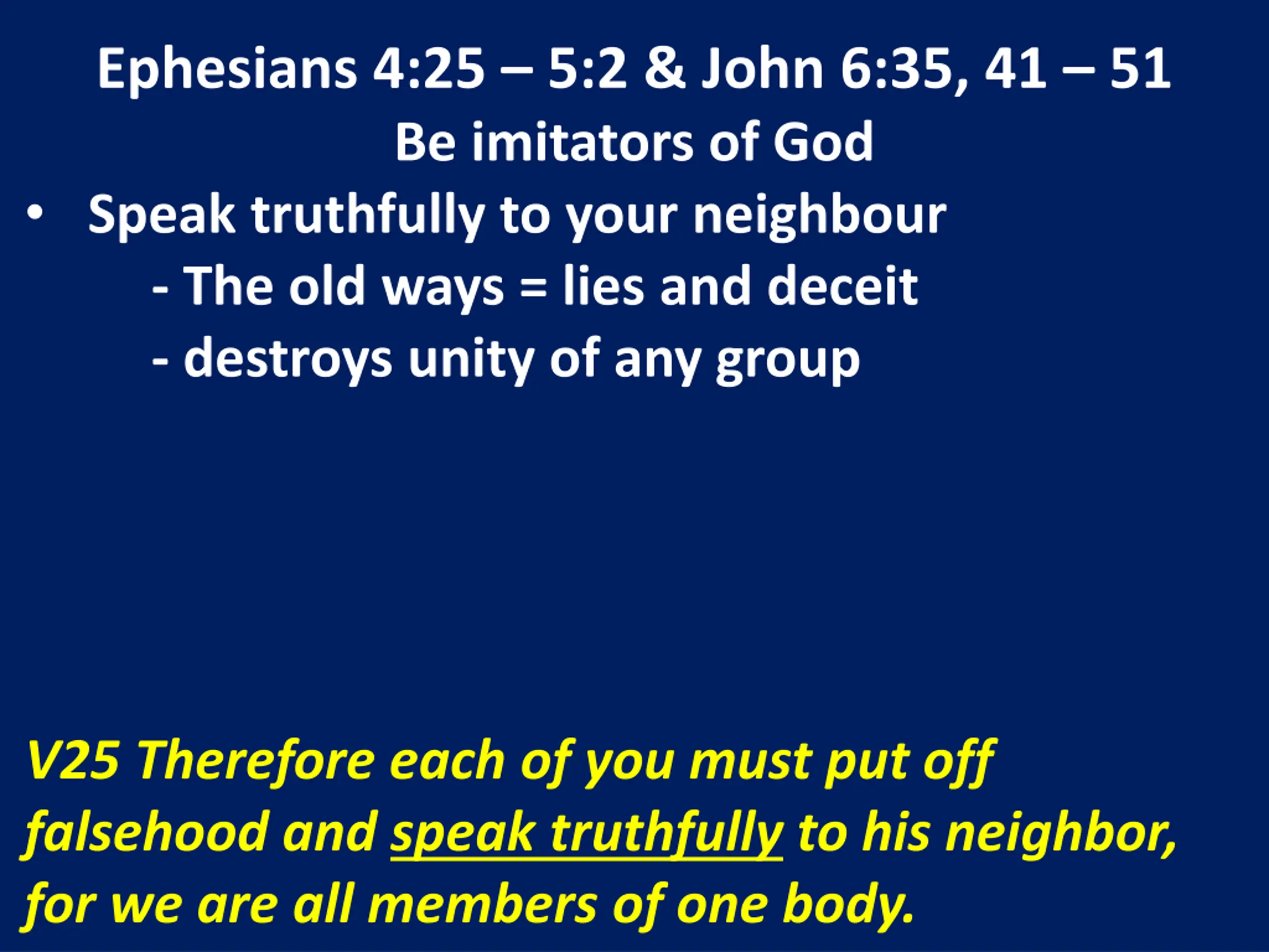Ephesians 4:25 5:2 & John 6:35, 41 51 Be imitators of God Speak truthfully to your neighbour - The old ways = lies and deceit - destroys unity of any group V25 Therefore each of you must put off falsehood and speak truthfully to his neighbor, for we are all members of one body.