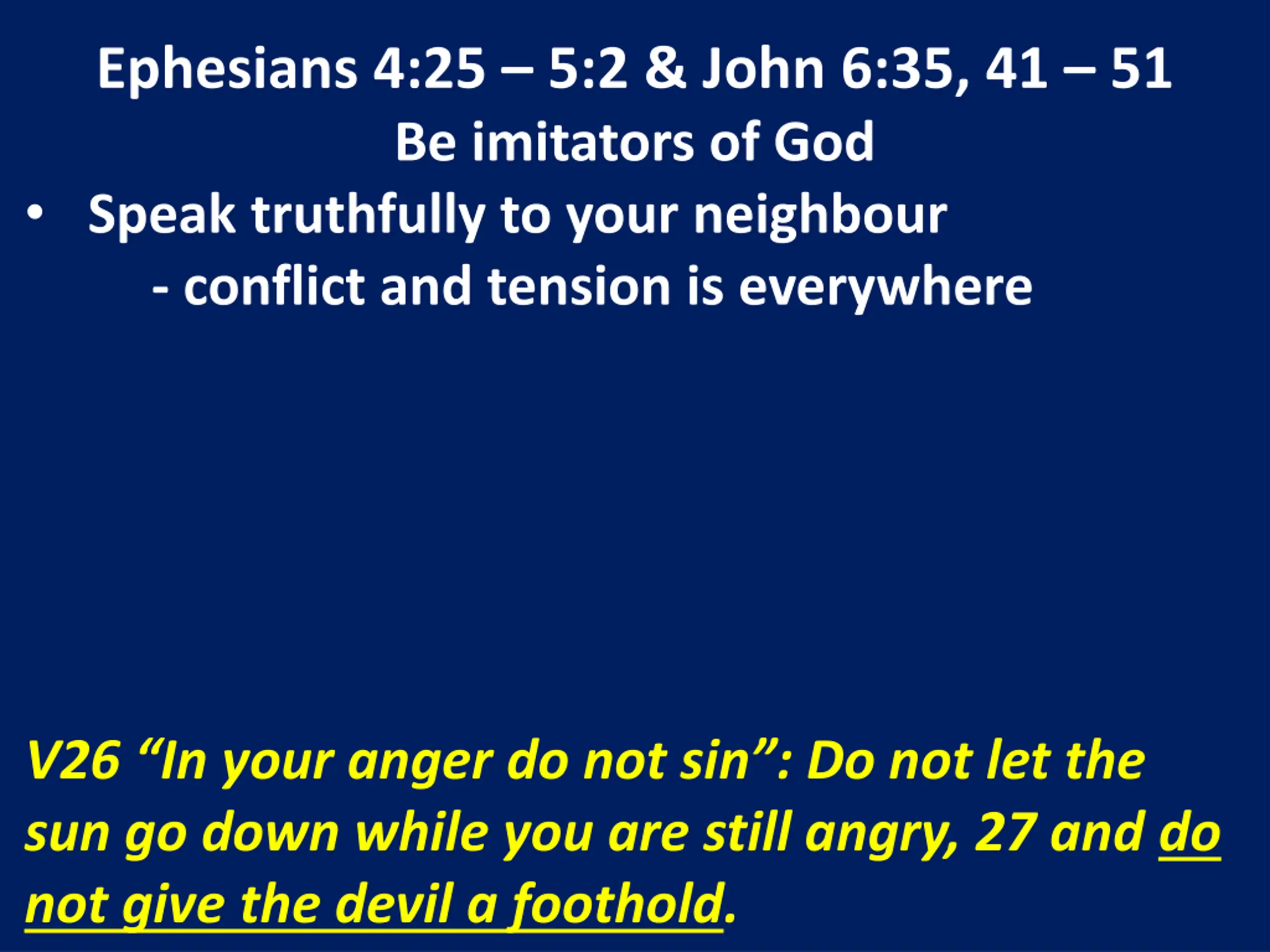 Ephesians 4:25 5:2 & John 6:35, 41 51 Be imitators of God Speak truthfully to your neighbour - conflict and tension is everywhere V26 In your anger do not sin : Do not let the sun go down while you are still angry, 27 and do not give the devil a foothold.