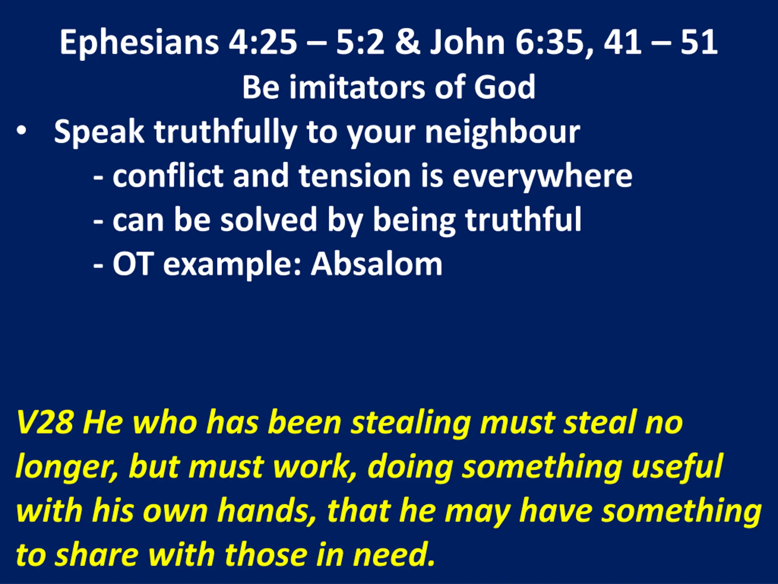 Ephesians 4:25 5:2 & John 6:35, 41 51 Be imitators of God Speak truthfully to your neighbour - conflict and tension is everywhere - can be solved by being truthful - OT example: Absalom V28 He who has been stealing must steal no longer, but must work, doing something useful with his own hands, that he may have something to share with those in need.