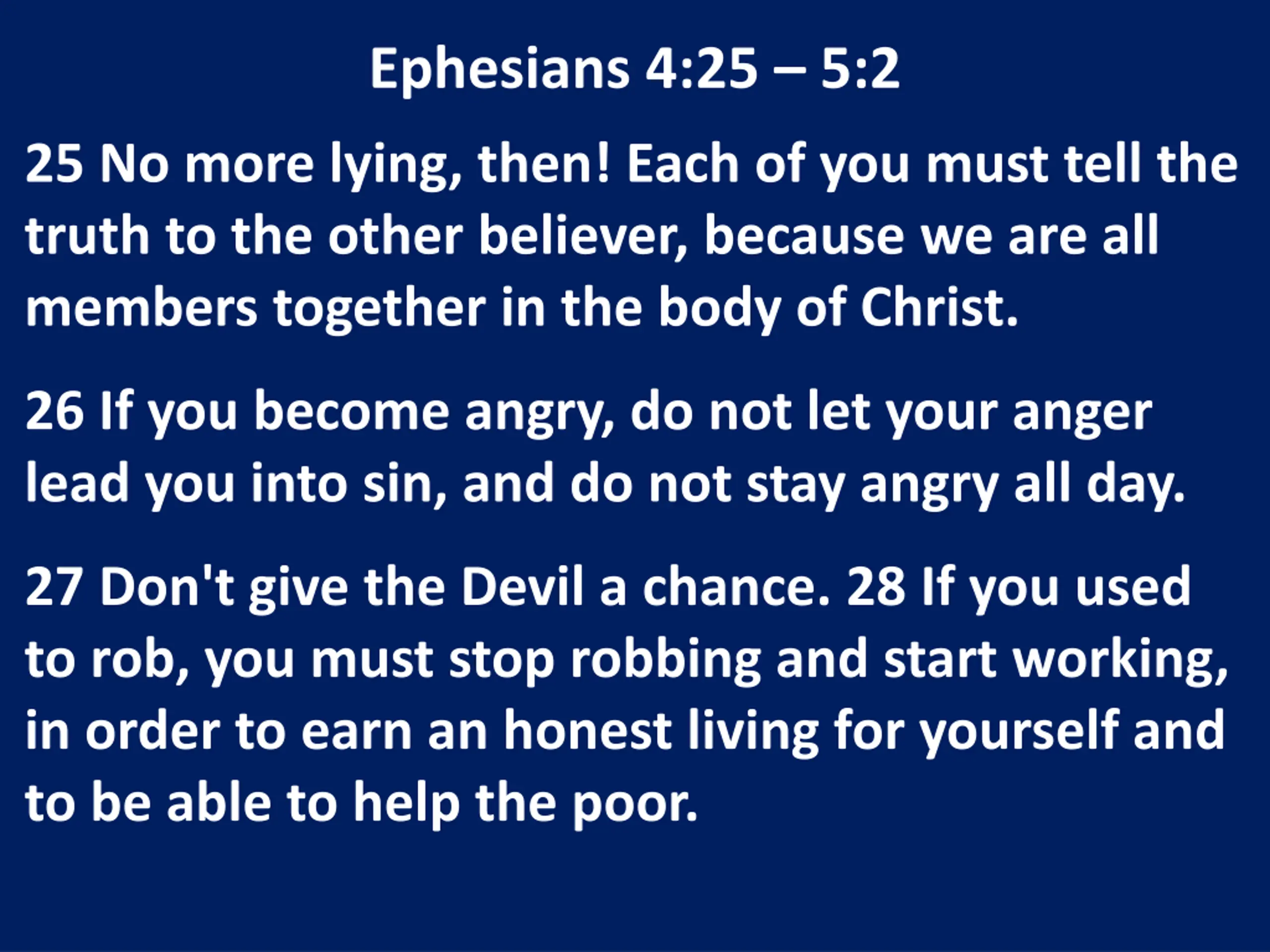 Ephesians 4:25 5:2 25 No more lying, then! Each of you must tell the truth to the other believer, because we are all members together in the body of Christ. 26 If you become angry, do not let your anger lead you into sin, and do not stay angry all day. 27 Don't give the Devil a chance. 28 If you used to rob, you must stop robbing and start working, in order to earn an honest living for yourself and to be able to help the poor.