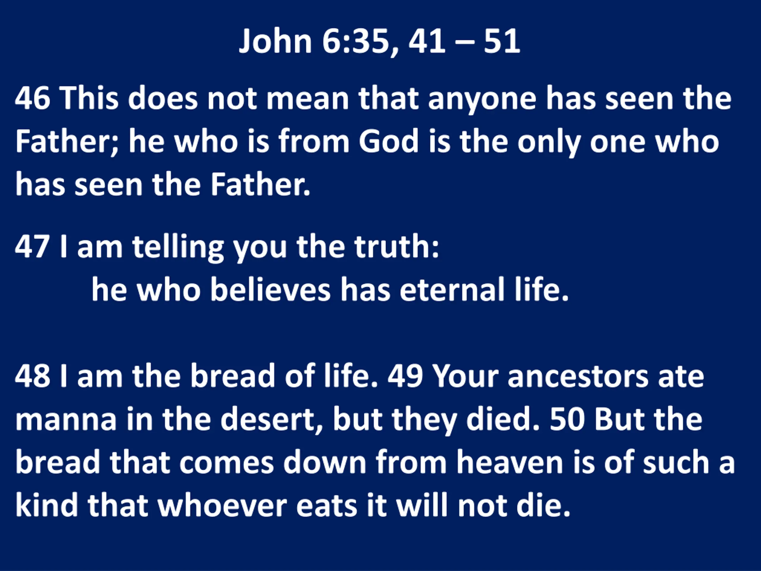 John 6:35, 41 51 46 This does not mean that anyone has seen the Father; he who is from God is the only one who has seen the Father. 47 I am telling you the truth: he who believes has eternal life. 48 I am the bread of life. 49 Your ancestors ate manna in the desert, but they died. 50 But the bread that comes down from heaven is of such a kind that whoever eats it will not die.