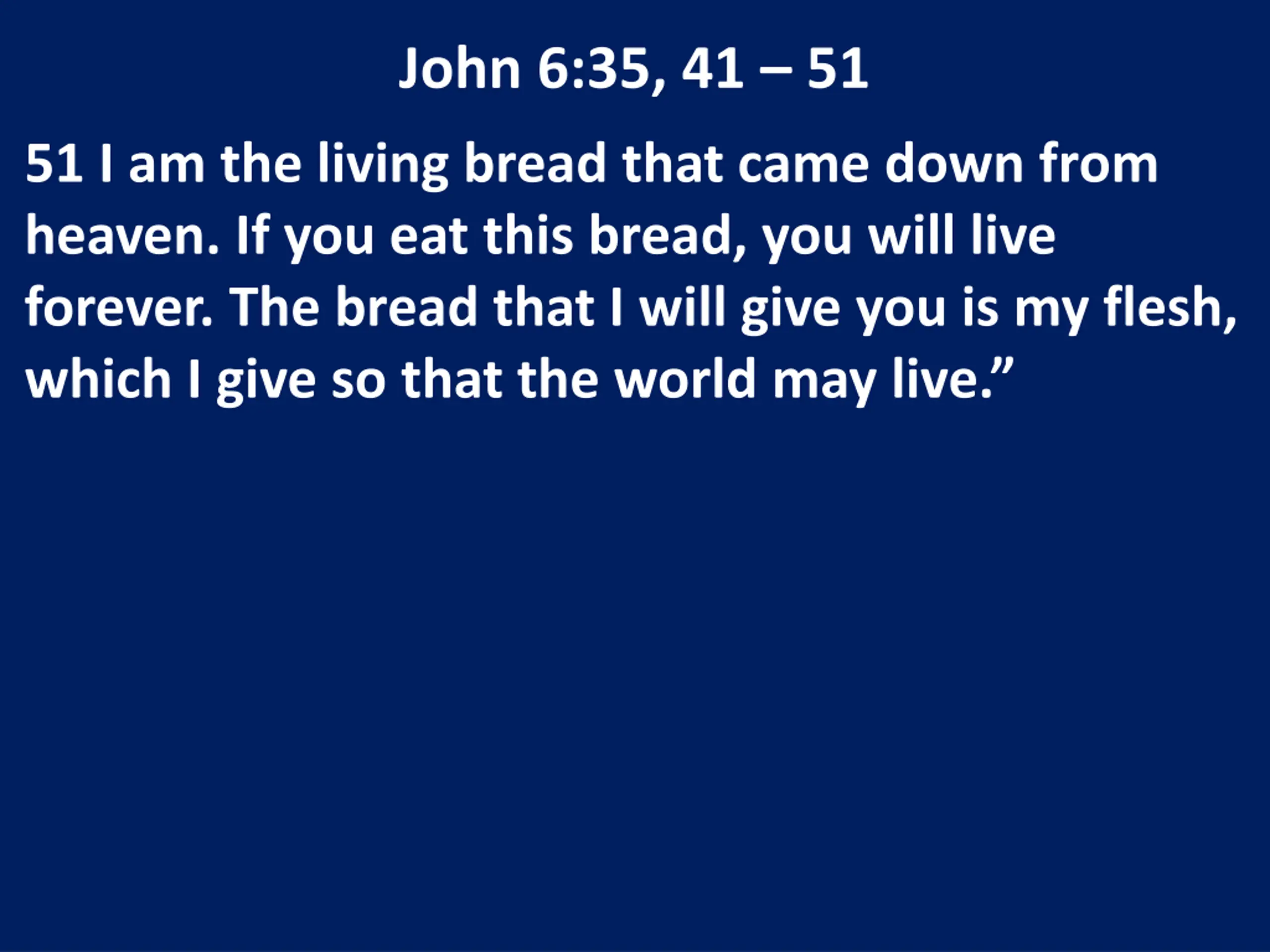 John 6:35, 41 51 51 I am the living bread that came down from heaven. If you eat this bread, you will live forever. The bread that I will give you is my flesh, which I give so that the world may live.