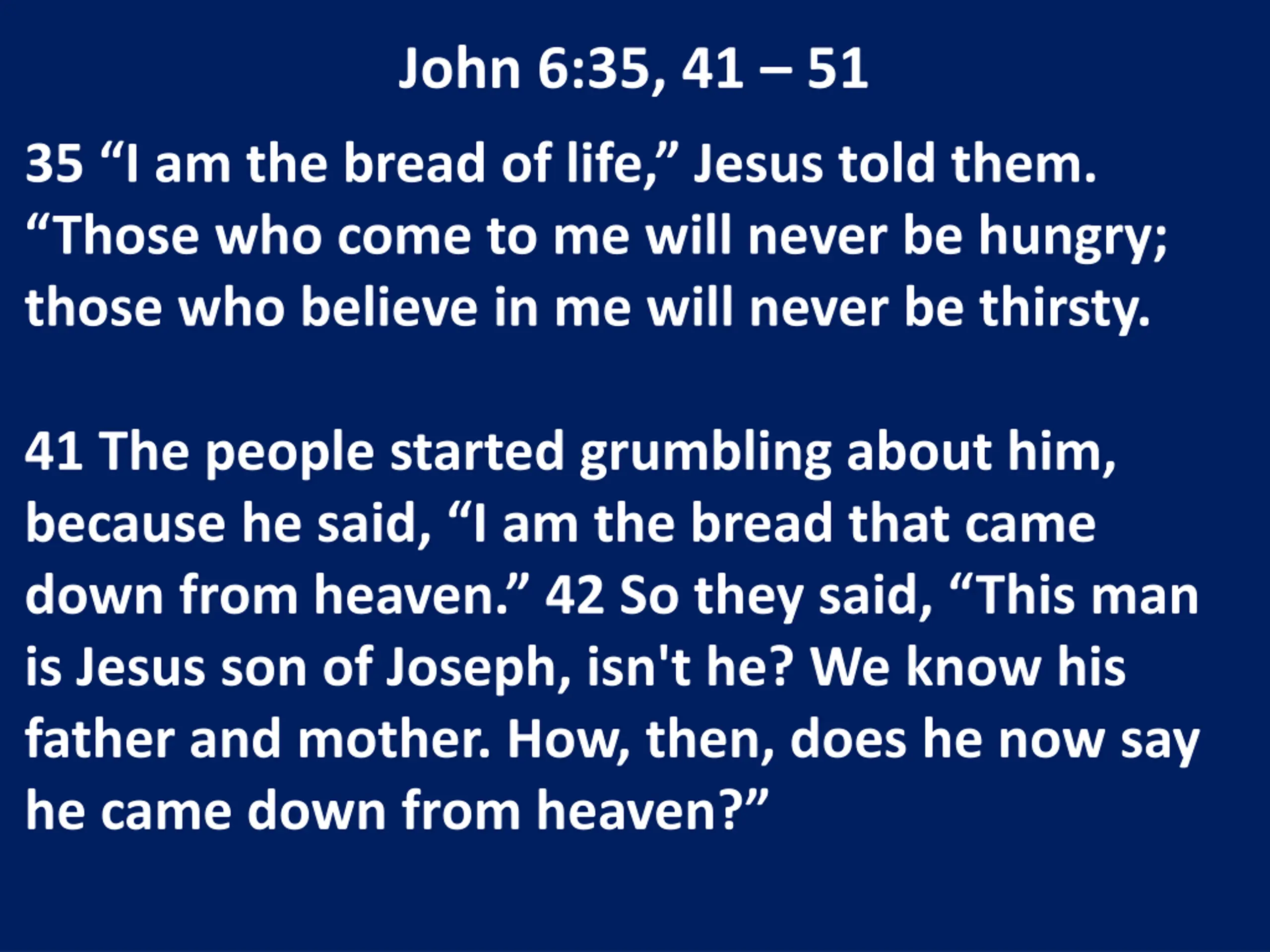 John 6:35, 41 51 35 I am the bread of life, Jesus told them. Those who come to me will never be hungry; those who believe in me will never be thirsty. 41 The people started grumbling about him, because he said, I am the bread that came down from heaven. 42 So they said, This man is Jesus son of Joseph, isn't he? We know his father and mother. How, then, does he now say he came down from heaven?