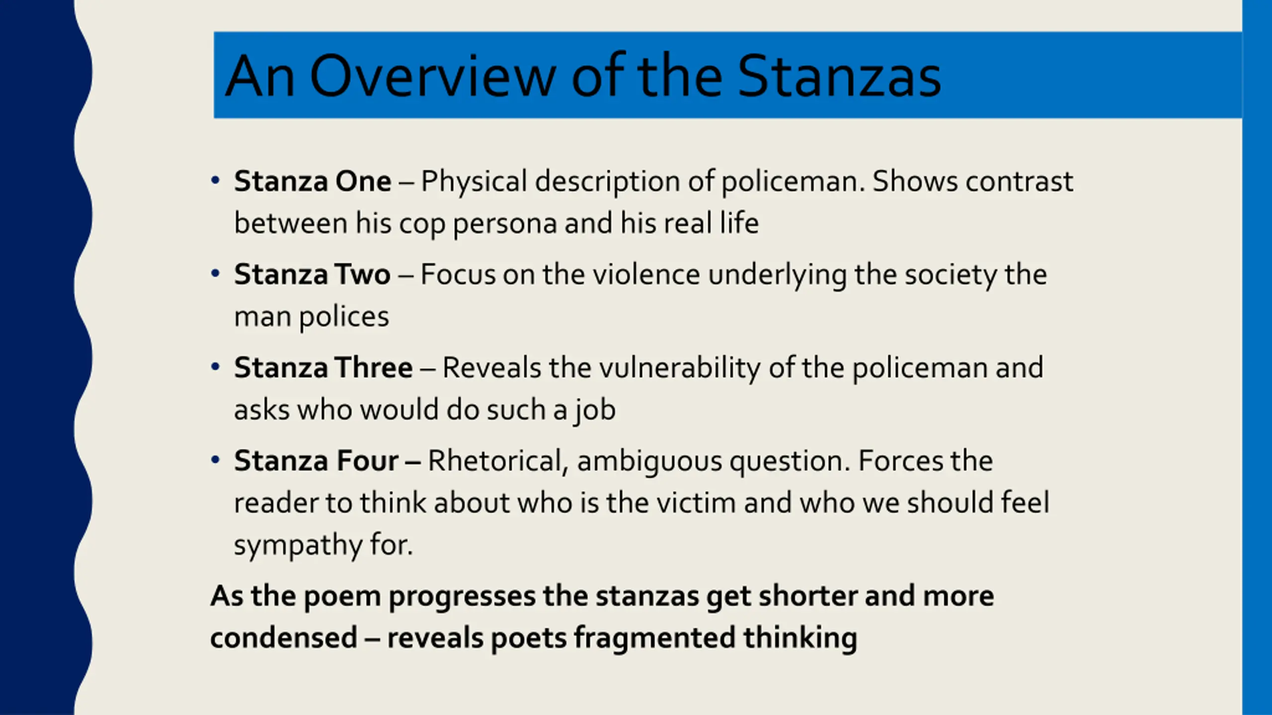 An Overview of the Stanzas Stanza One Physical description of policeman. Shows contrast between his cop persona and his real life Stanza Two Focus on the violence underlying the society the man polices Stanza Three Reveals the vulnerability of the policeman and asks who would do such a job Stanza Four Rhetorical, ambiguous question. Forces the reader to think about who is the victim and who we should feel sympathy for. As the poem progresses the stanzas get shorter and more condensed reveals poets fragmented thinking