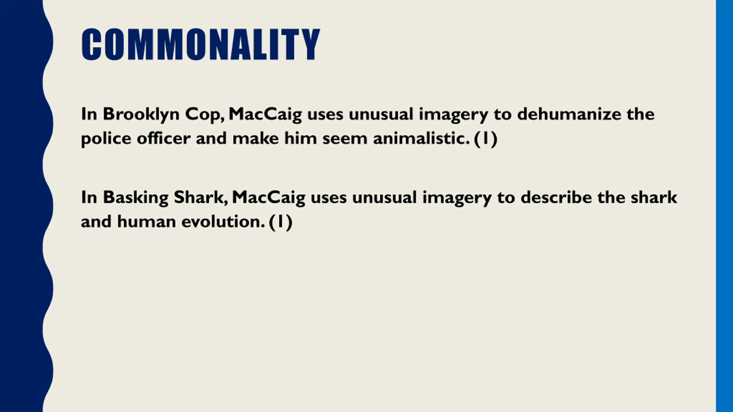 COMMONALITY In Brooklyn Cop, MacCaig uses unusual imagery to dehumanize the police officer and make him seem animalistic. (1) In Basking Shark, MacCaig uses unusual imagery to describe the shark and human evolution. (1)