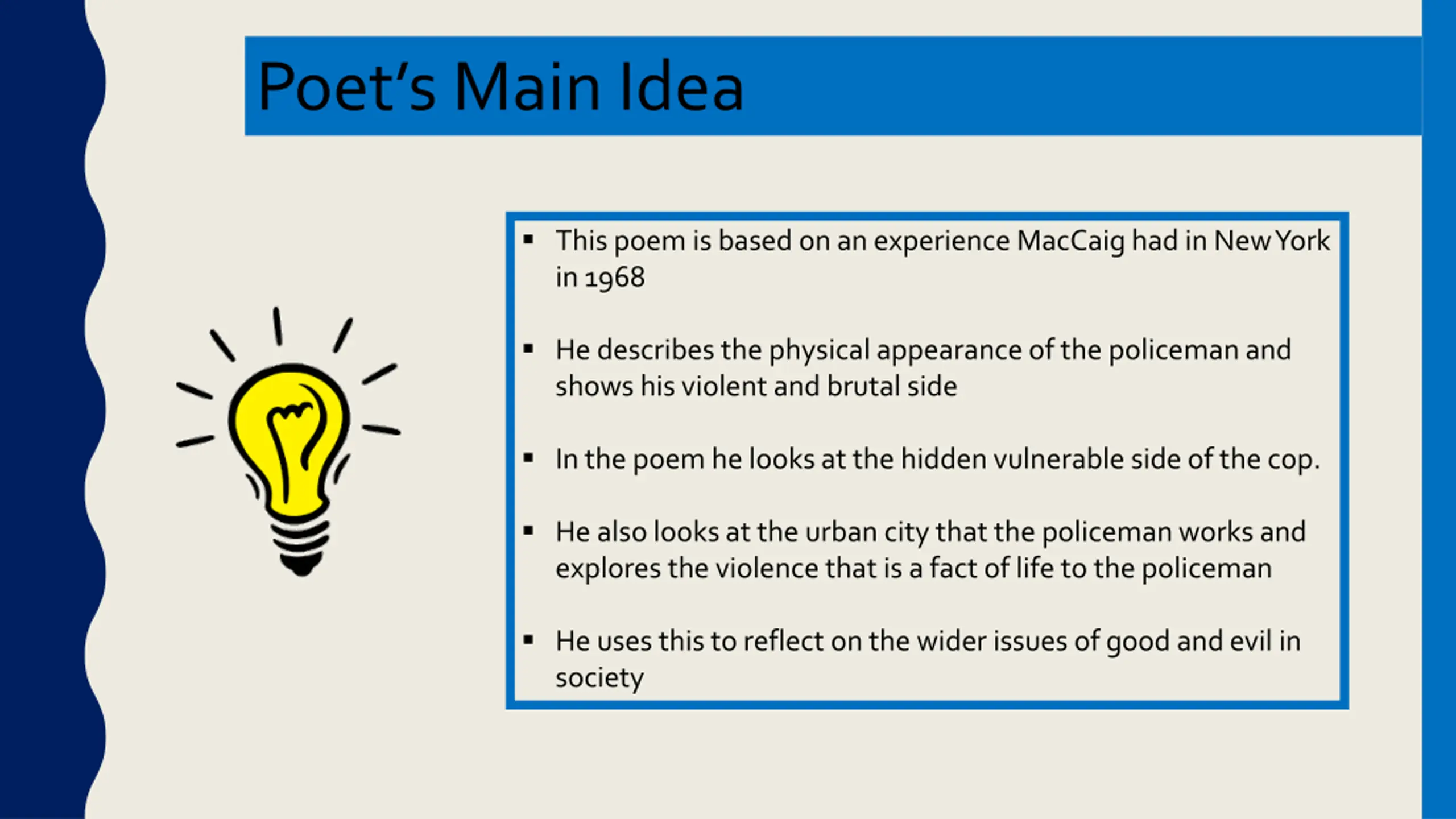 Poets Main Idea This poem is based on an experience MacCaig had in New York in 1968 He describes the physical appearance of the policeman and shows his violent and brutal side In the poem he looks at the hidden vulnerable side of the cop. He also looks at the urban city that the policeman works and explores the violence that is a fact of life to the policeman He uses this to reflect on the wider issues of good and evil in society