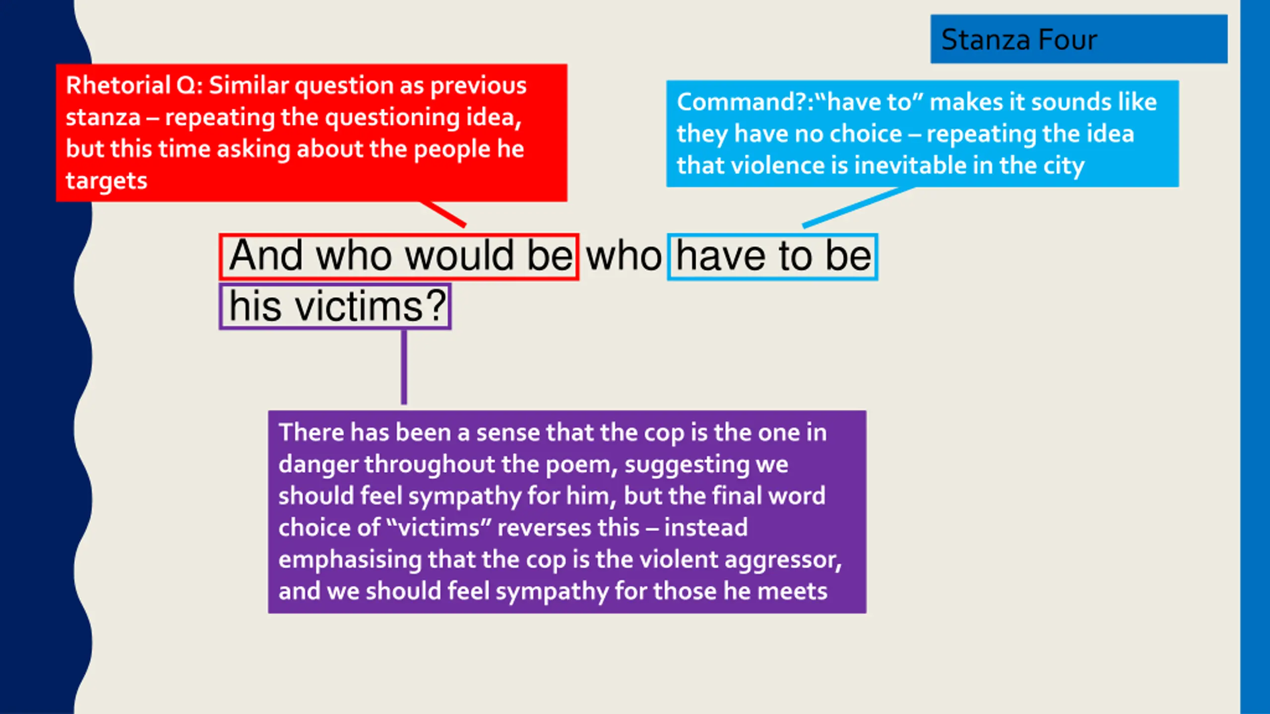 Stanza Four RhetorialQ: Similar question as previous stanza repeating the questioning idea, but this time asking about the people he targets Command?: have to makes it sounds like they have no choice repeating the idea that violence is inevitable in the city And who would be who have to be his victims? There has been a sense that the cop is the one in danger throughout the poem, suggesting we should feel sympathy for him, but the final word choice of victims reverses this instead emphasising that the cop is the violent aggressor, and we should feel sympathy for those he meets