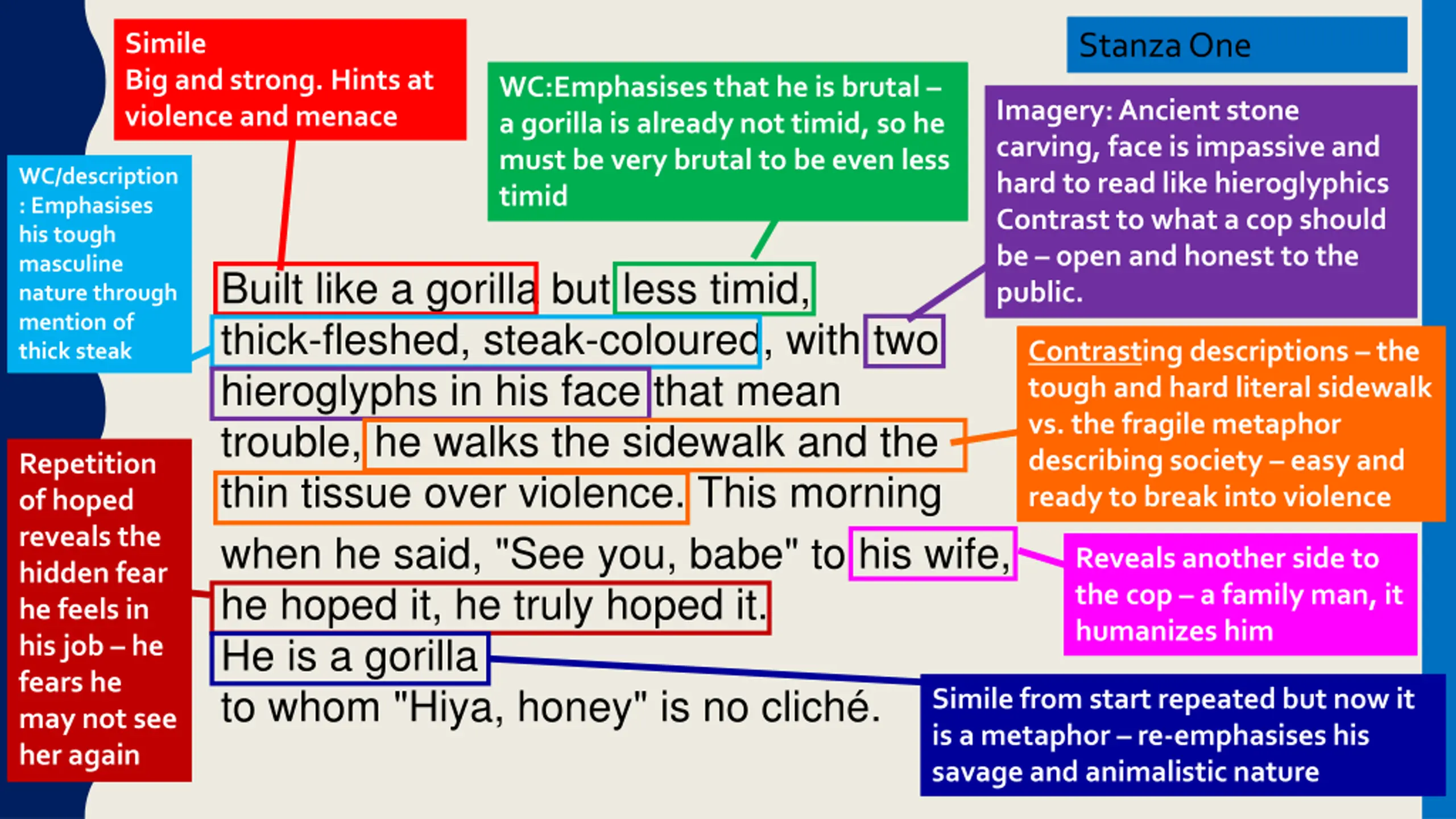 Stanza One Simile Big and strong. Hints at violence and menace WC:Emphasises that he is brutal a gorilla is already not timid, so he must be very brutal to be even less timid Imagery: Ancient stone carving, face is impassive and hard to read like hieroglyphics Contrast to what a cop should be open and honest to the public. WC/description : Emphasises his tough masculine nature through mention of thick steak Built like a gorilla but less timid, thick-fleshed, steak-coloured, with two hieroglyphs in his face that mean trouble, he walks the sidewalk and the thin tissue over violence. This morning when he said, "See you, babe" to his wife, he hoped it, he truly hoped it. He is a gorilla to whom "Hiya, honey" is no clich . Contrasting descriptions the tough and hard literal sidewalk vs. the fragile metaphor describing society easy and ready to break into violence Repetition of hoped reveals the hidden fear he feels in his job he fears he may not see her again Reveals another side to the cop a family man, it humanizes him Simile from start repeated but now it is a metaphor re-emphasises his savage and animalistic nature