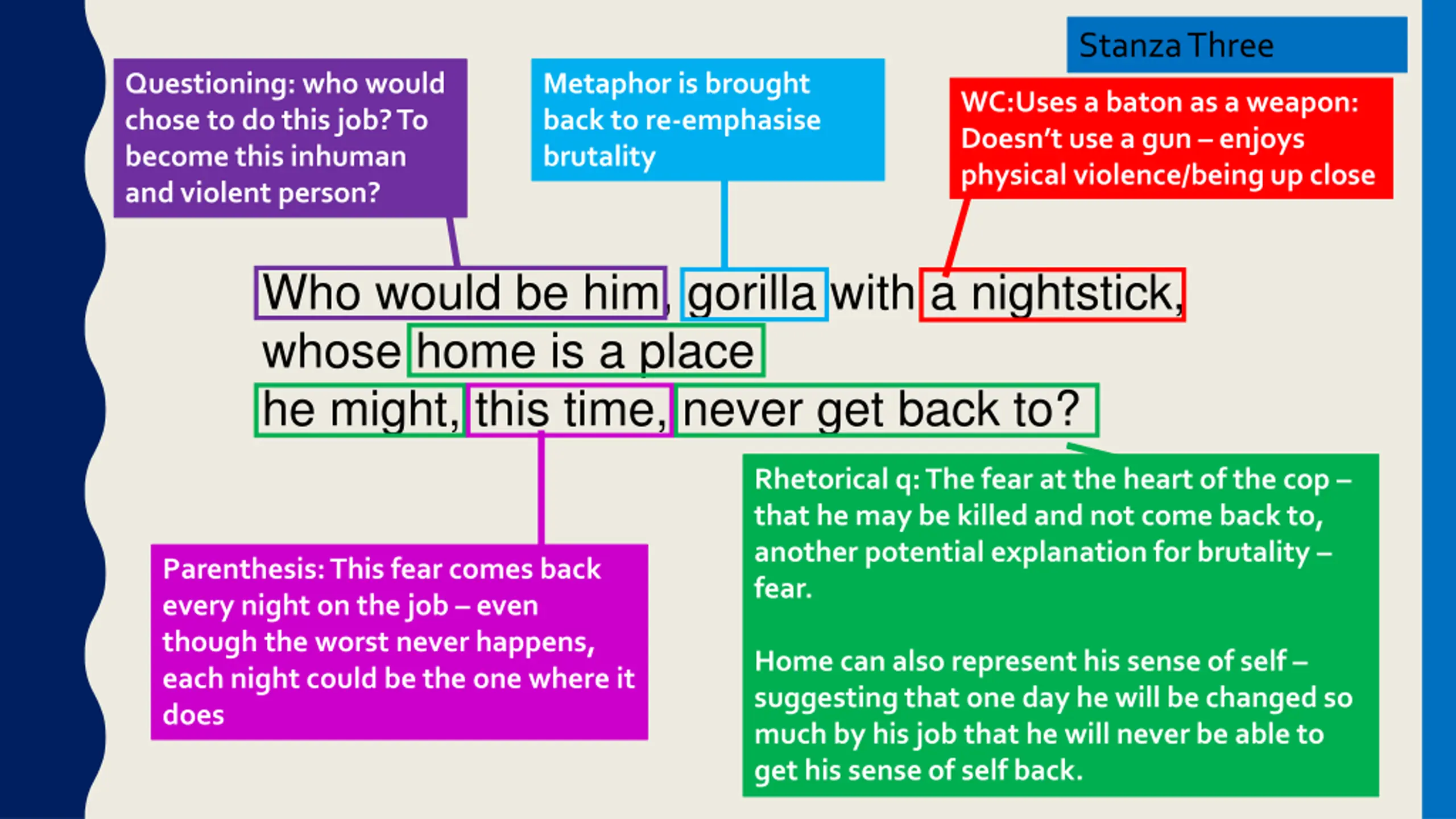 Stanza Three Questioning: who would chose to do this job? To become this inhuman and violent person? Metaphor is brought back to re-emphasise brutality WC:Uses a baton as a weapon: Doesn t use a gun enjoys physical violence/being up close Who would be him, gorilla with a nightstick, whose home is a place he might, this time, never get back to? Rhetorical q: The fear at the heart of the cop that he may be killed and not come back to, another potential explanation for brutality fear. Parenthesis: This fear comes back every night on the job even though the worst never happens, each night could be the one where it does Home can also represent his sense of self suggesting that one day he will be changed so much by his job that he will never be able to get his sense of self back.