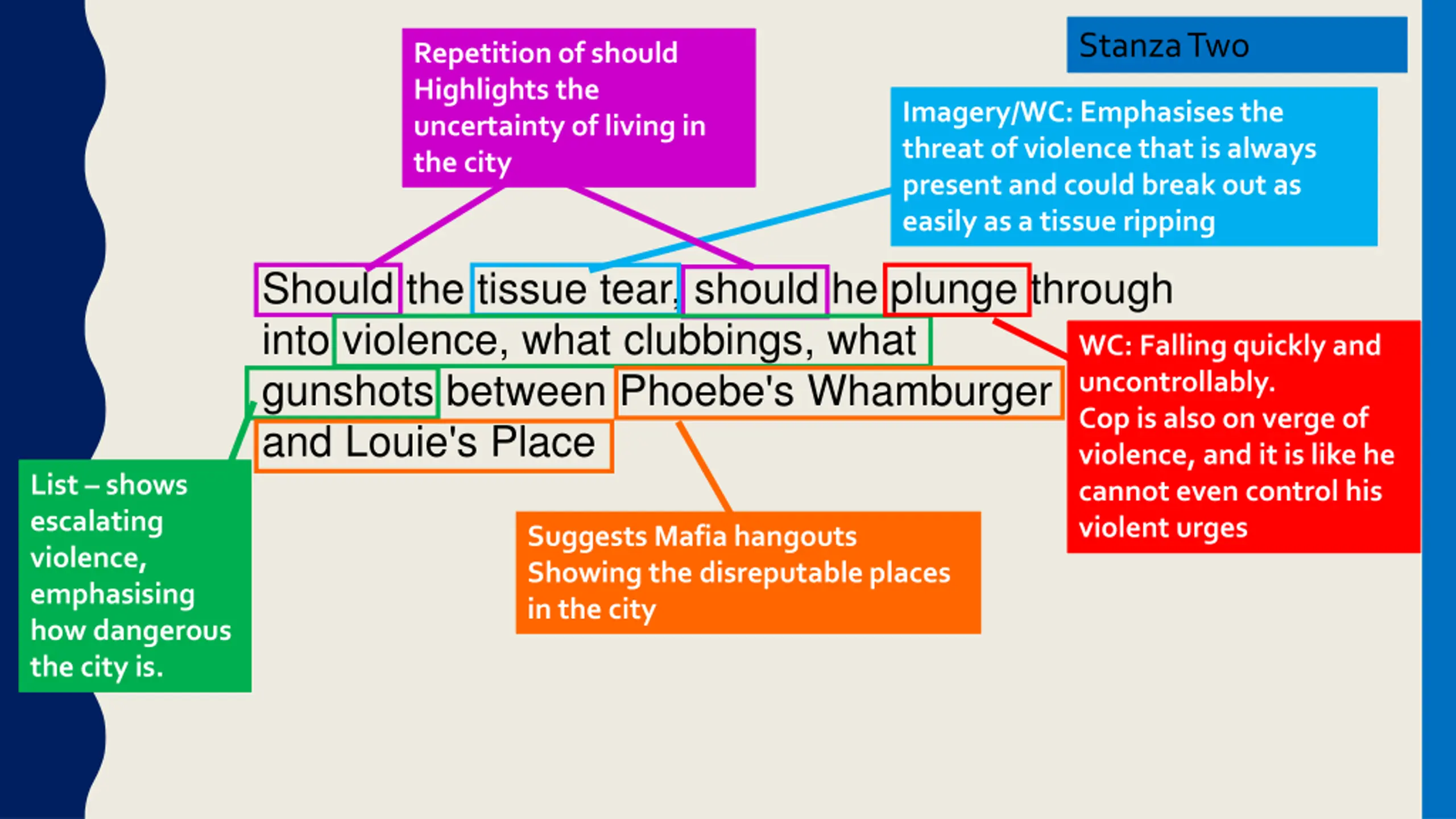 Stanza Two Repetition of should Highlights the uncertainty of living in the city Imagery/WC: Emphasises the threat of violence that is always present and could break out as easily as a tissue ripping Should the tissue tear, should he plunge through into violence, what clubbings, what gunshots between Phoebe's Whamburger and Louie's Place WC: Falling quickly and uncontrollably. Cop is also on verge of violence, and it is like he cannot even control his violent urges List shows escalating violence, emphasising how dangerous the city is. Suggests Mafia hangouts Showing the disreputable places in the city