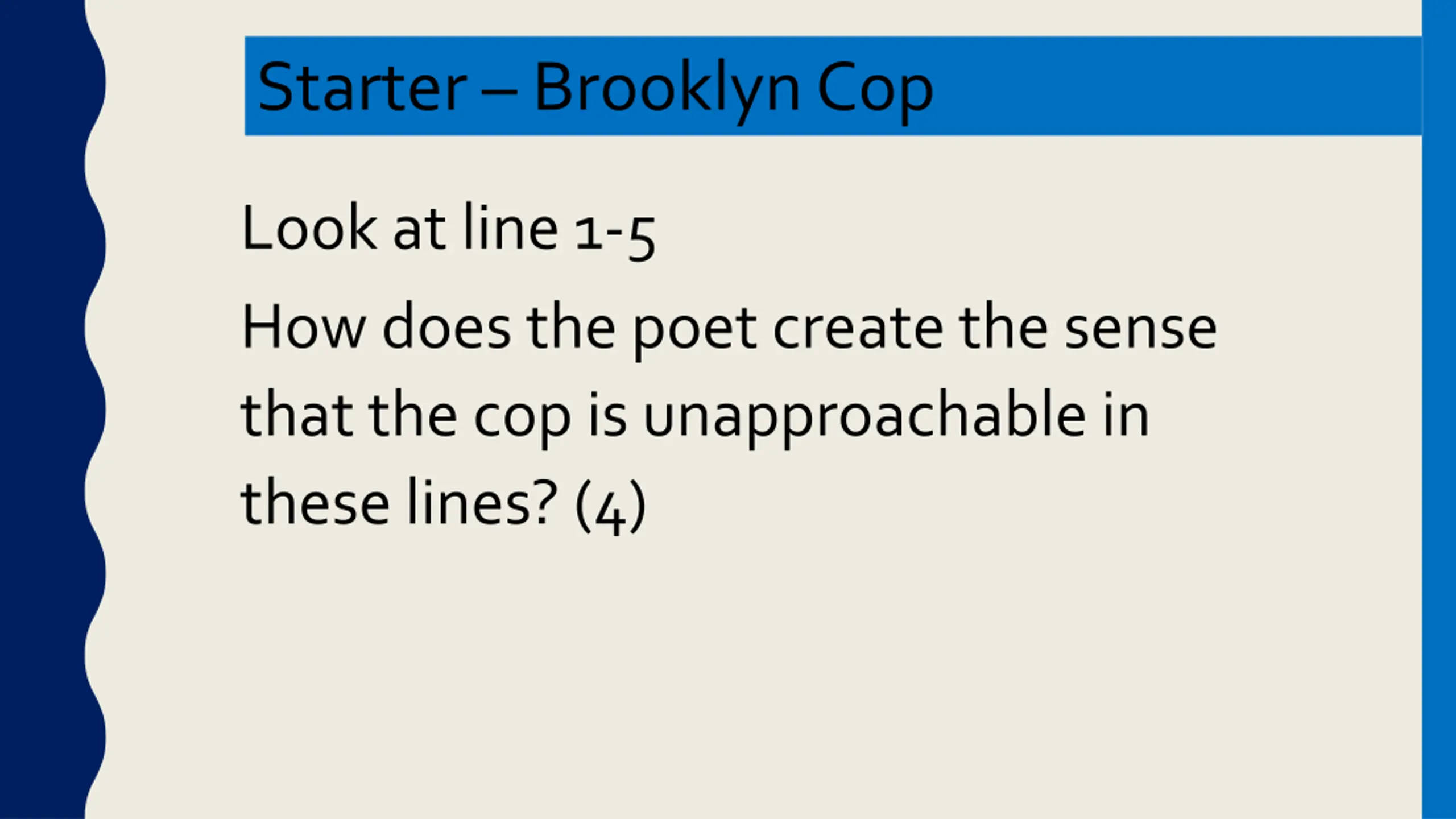 Starter Brooklyn Cop Look at line 1-5 How does the poet create the sense that the cop is unapproachable in these lines? (4)