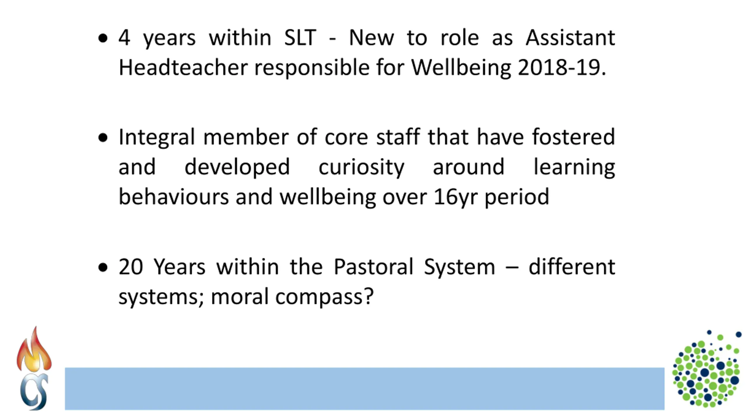 4 years within SLT - New to role as Assistant Headteacher responsible for Wellbeing 2018-19. Integral member of core staff that have fostered and developed curiosity around learning behaviours and wellbeing over 16yr period 20 Years within the Pastoral System different systems; moral compass?