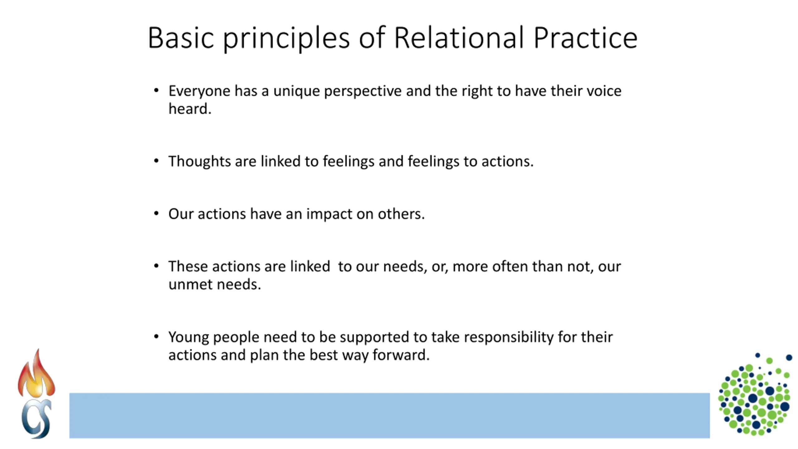 Basic principles of Relational Practice Everyone has a unique perspective and the right to have their voice heard. Thoughts are linked to feelings and feelings to actions. Our actions have an impact on others. These actions are linked to our needs, or, more often than not, our unmet needs. Young people need to be supported to take responsibility for their actions and plan the best way forward.