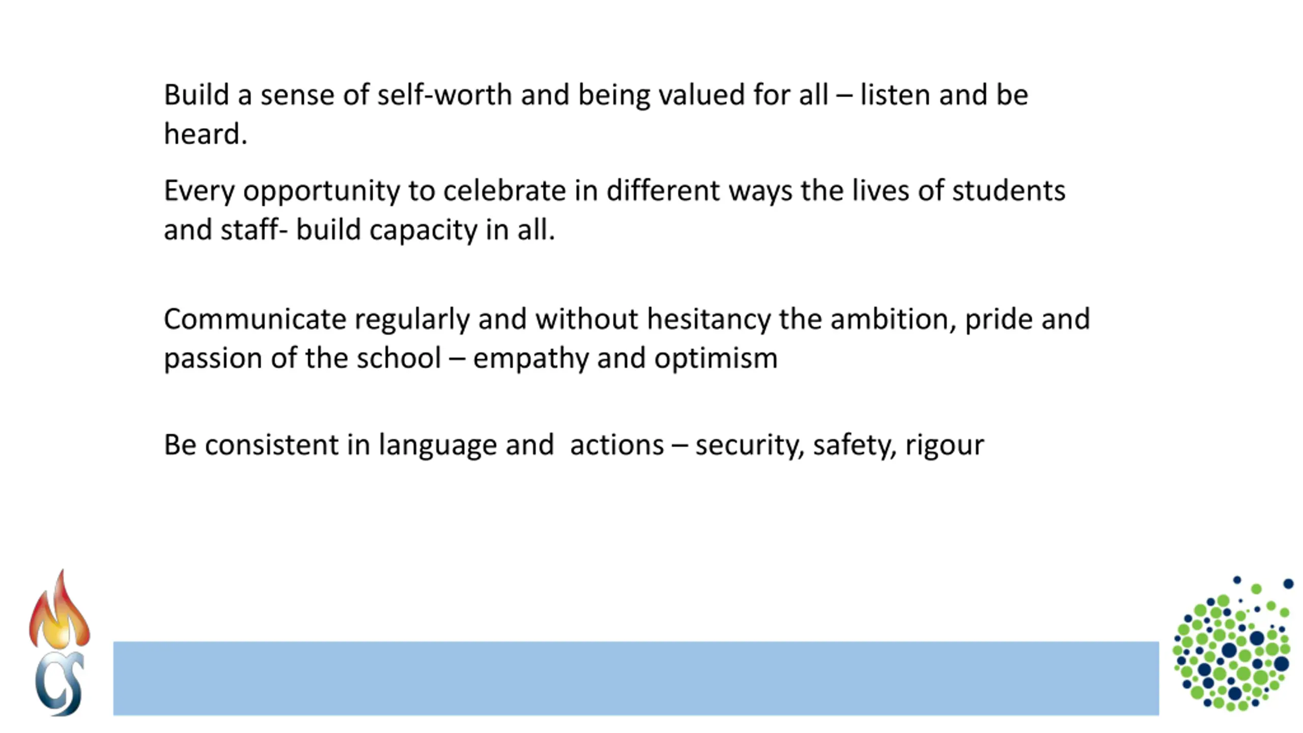 Build a sense of self-worth and being valued for all listen and be heard. Every opportunity to celebrate in different ways the lives of students and staff- build capacity in all. Communicate regularly and without hesitancy the ambition, pride and passion of the school empathy and optimism Be consistent in language and actions security, safety, rigour