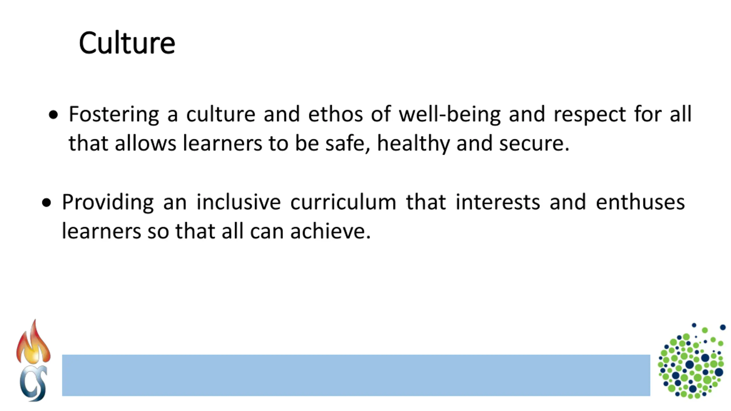 Culture Culture Fostering a culture and ethos of well-being and respect for all that allows learners to be safe, healthy and secure. Providing an inclusive curriculum that interests and enthuses learners so that all can achieve.