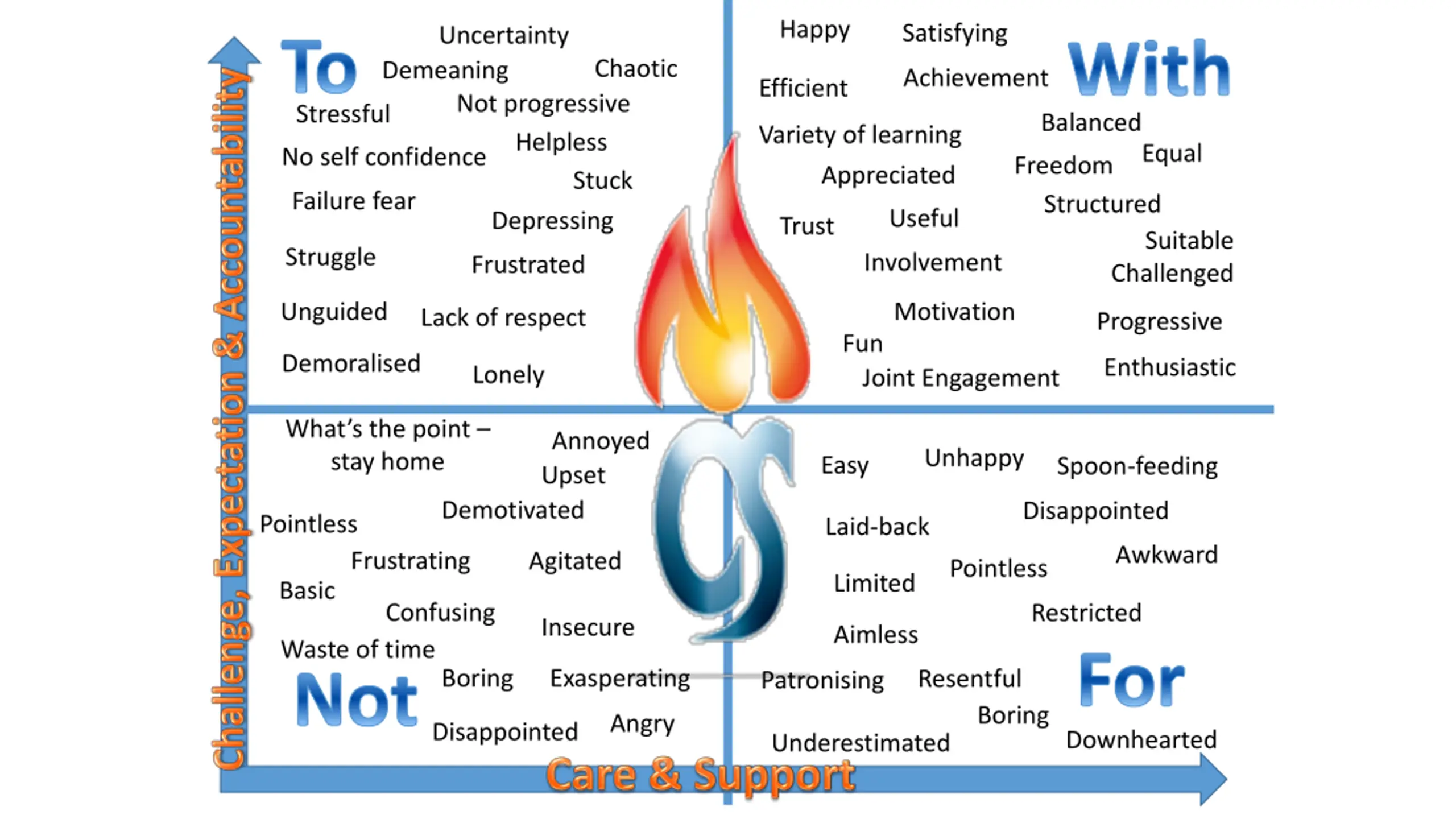 Happy Satisfying Uncertainty To Stressful With Balanced Chaotic Demeaning Achievement Efficient Not progressive Variety of learning Appreciated Helpless Equal No self confidence Freedom Structured Stuck Failure fear Useful Depressing Trust Suitable Challenged Struggle Involvement Frustrated Unguided Motivation Lack of respect Progressive Fun Demoralised Enthusiastic Lonely Joint Engagement What s the point stay home Annoyed Unhappy Easy Spoon-feeding Upset Demotivated Disappointed Pointless Laid-back Awkward Frustrating Agitated Pointless Limited Basic Confusing Restricted Insecure Aimless Waste of time For Downhearted Not Boring Exasperating Resentful Patronising Boring Angry Disappointed Underestimated